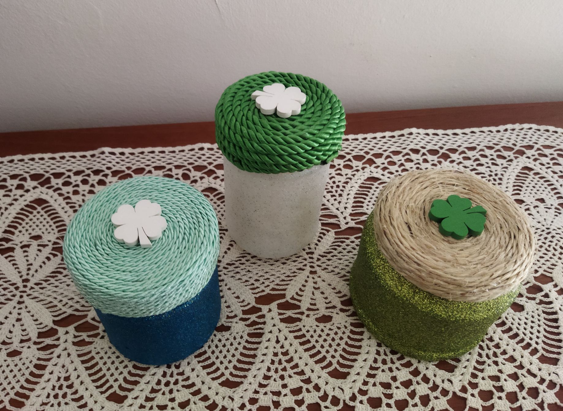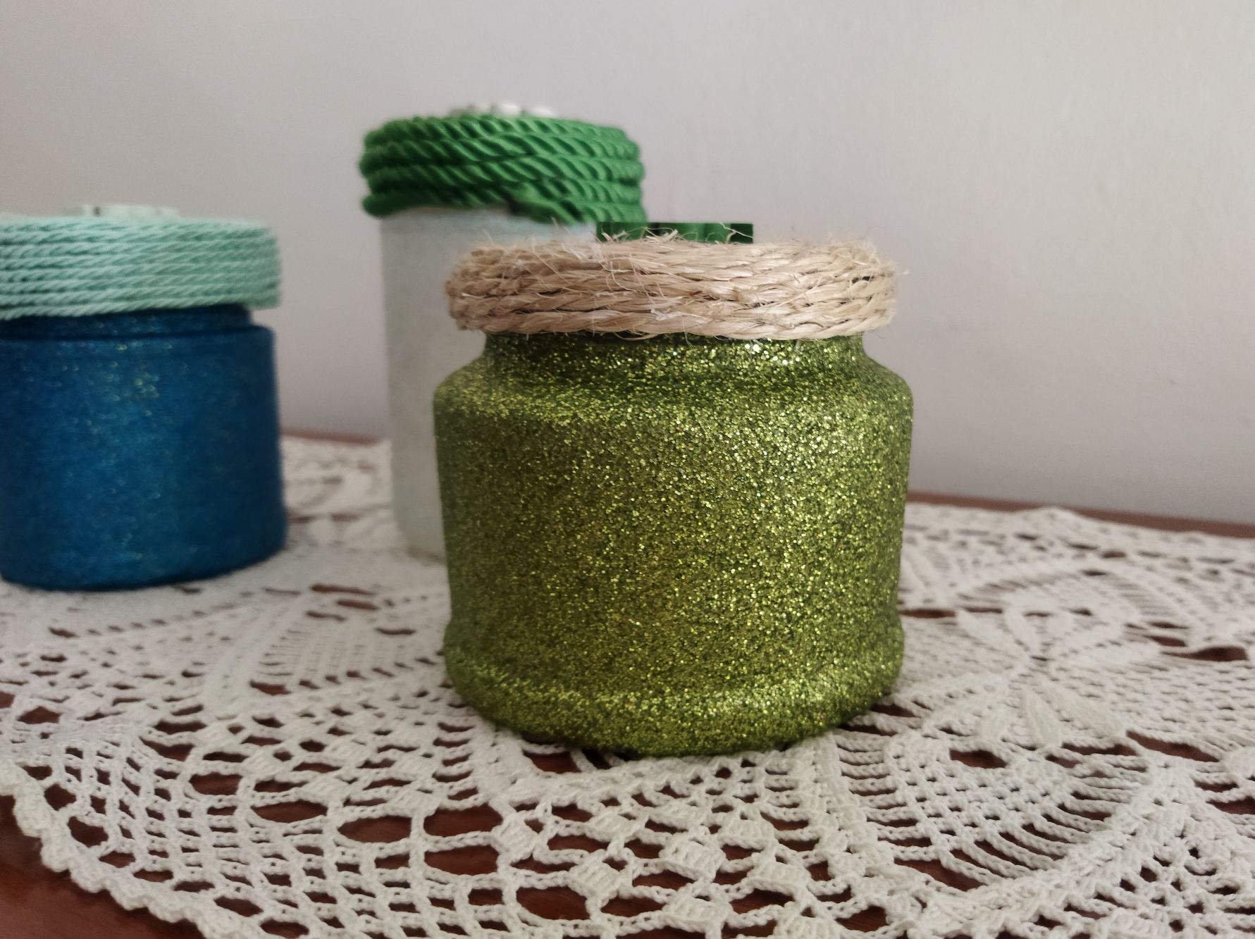 Salve a-mici !!! Nuova linea di creazione con barattoli riciclati : questi sono stati decorati con polvere glitter e il coperchio rivestito con yuta o cordoncino colorati di vari spessori.