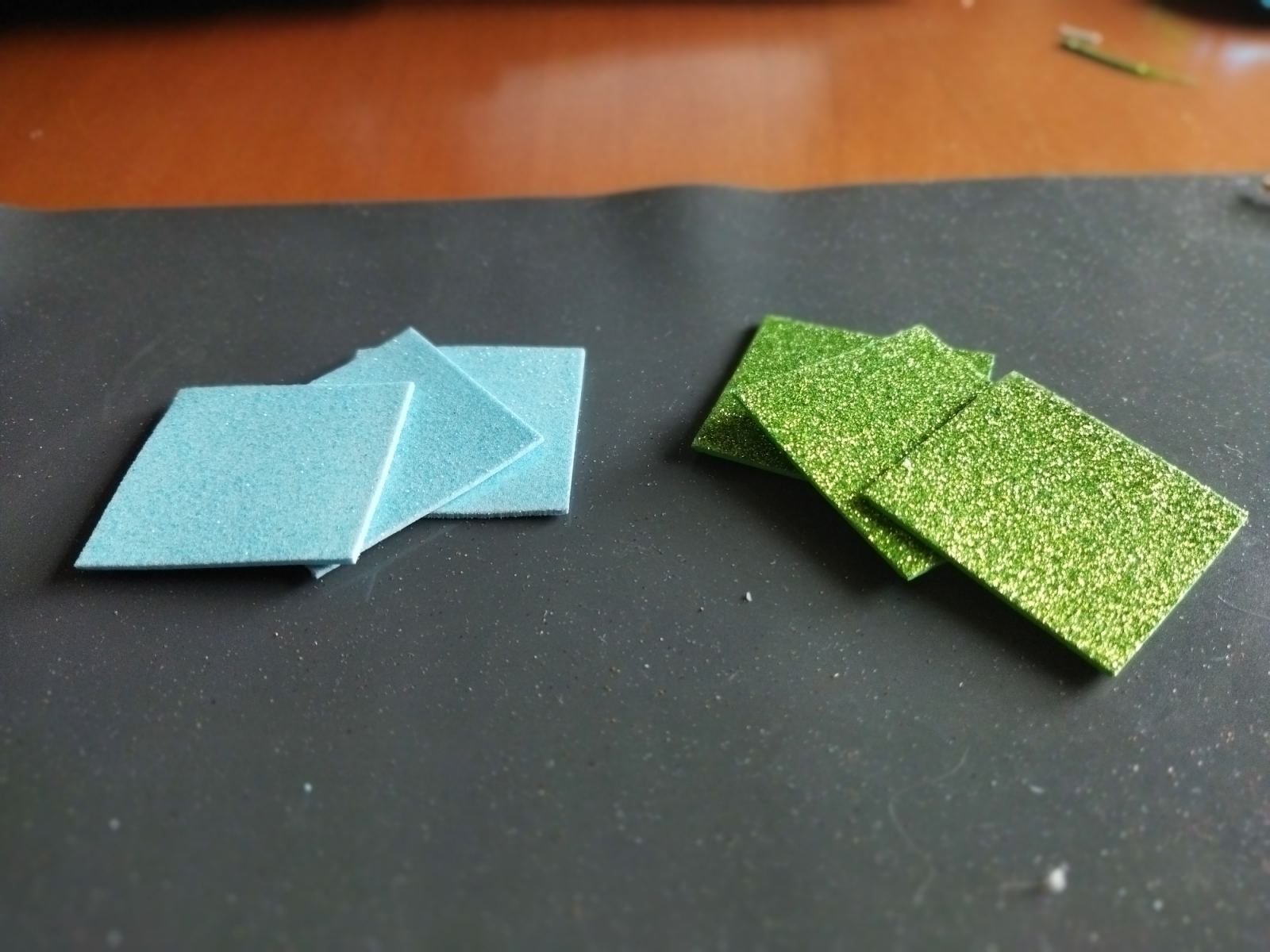 Dalla gomma eva ritagliamo da entrambi i due fogli di colore diverso di gomma eva, 3 quadrati per foglio della misura 5×5 cm. Quindi tagliano a metà lungo la diagonale, ogni quadrato