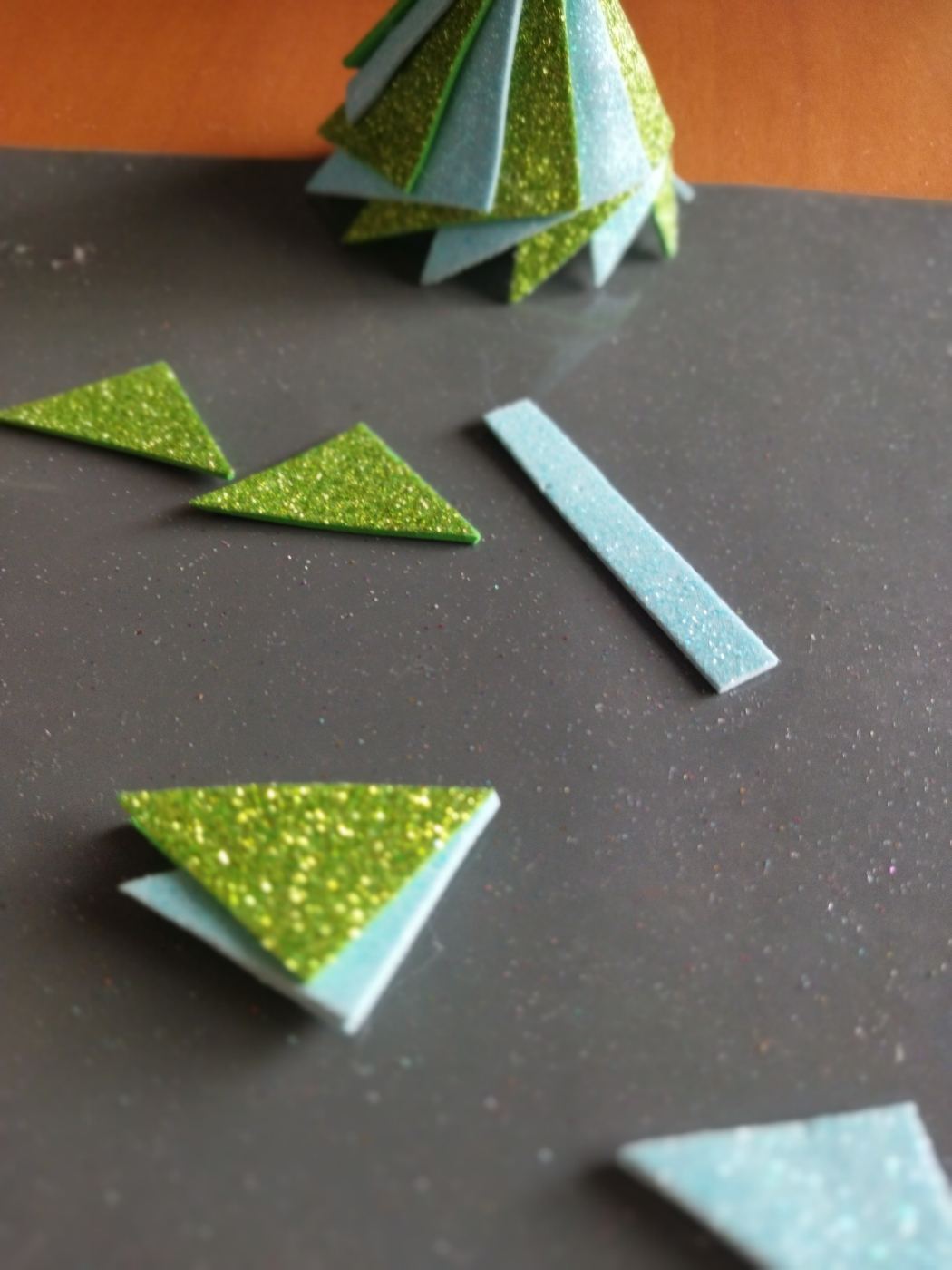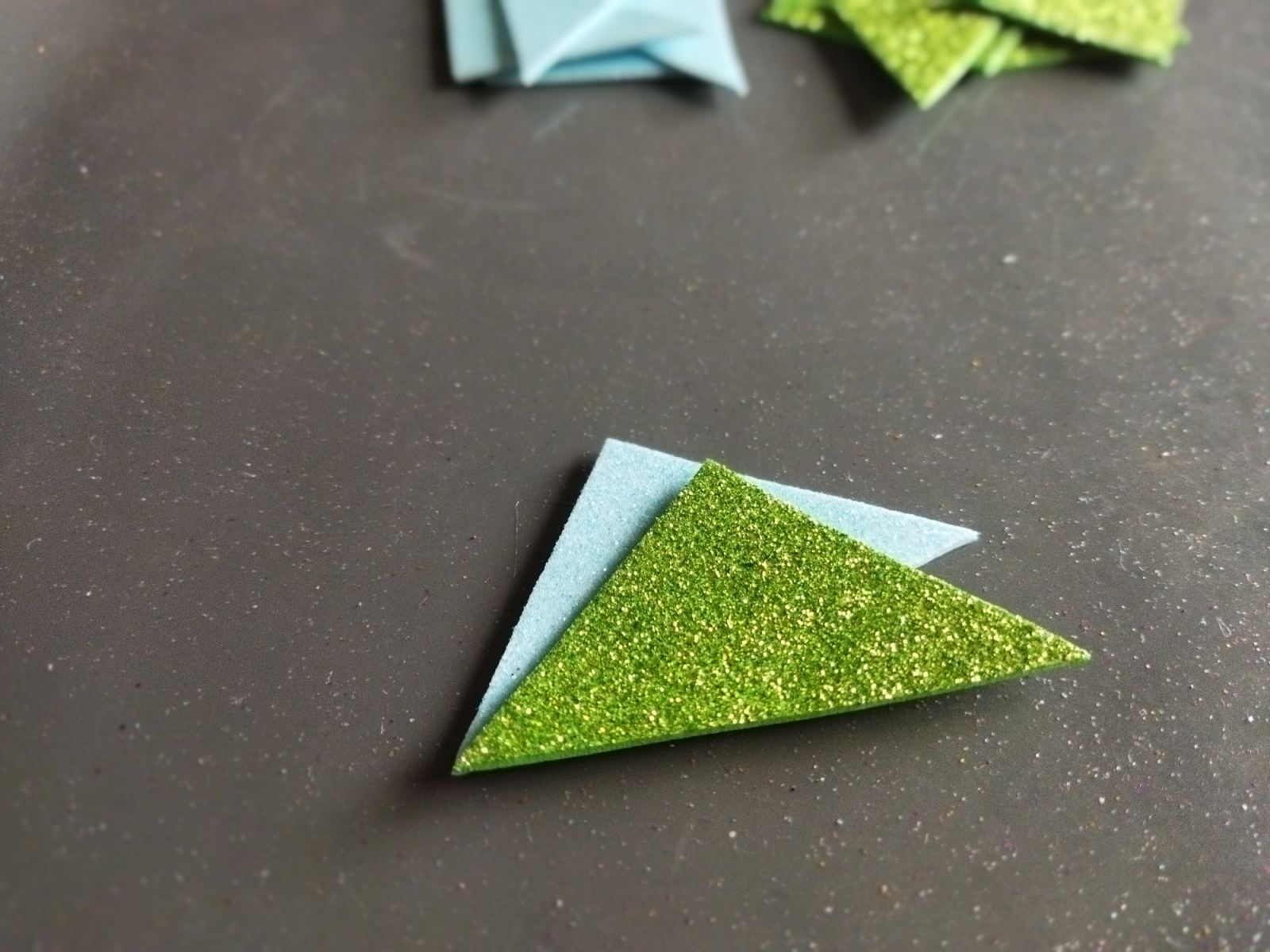 Incolliamo quindi, con lo stesso procedimento di prima, ma su entrambi i lati del triangolo celeste, i triangoli verdi, a mò di panino, e incolliamo tra loro nella parte che sporgono i triangoli verdi