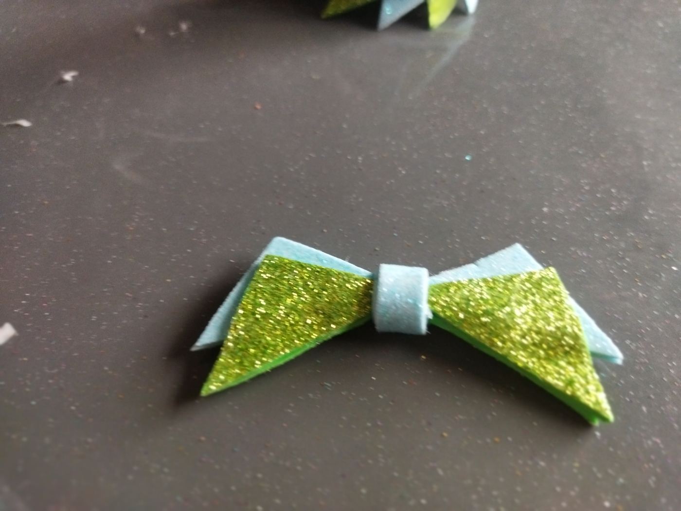 Per realizzare le ali, incolliamo dalla parte non glitterata, a due a due tra di loro, i triangoli dello stesso colore. Otterremo così due triangoli dello spessore di 4 mm.