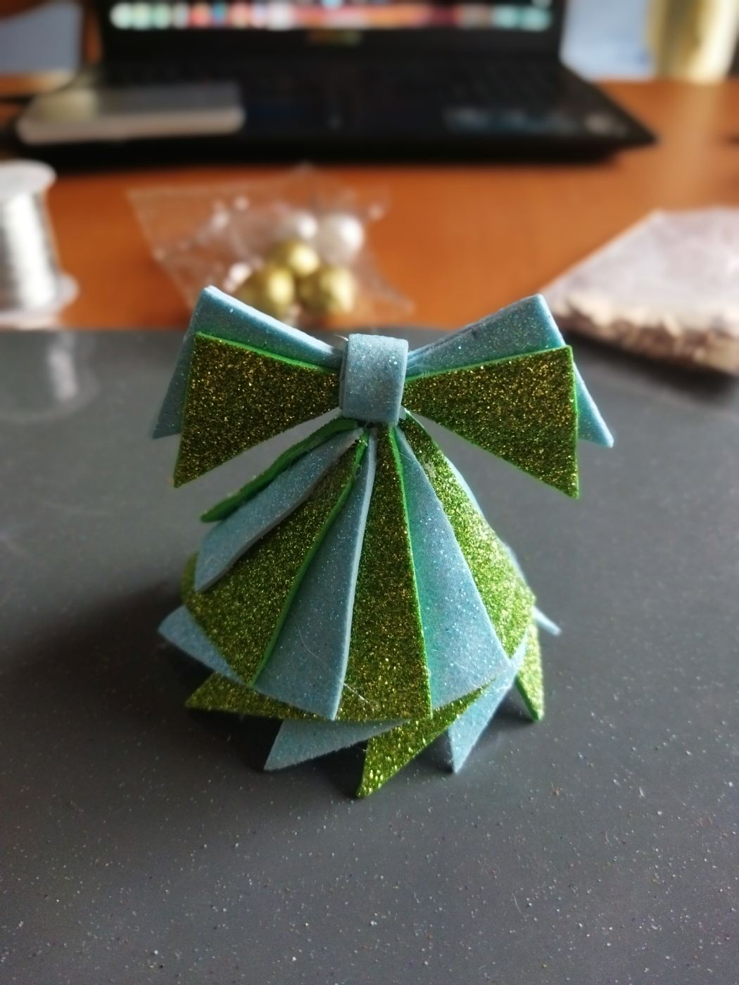 Quando tutti i triangoli saranno stati incollati, incolliamo il primo e l’ultimo, sempre rispettando la distanza di 1,5 cm. Avremo ottenuto così la gonna dell’angelo.