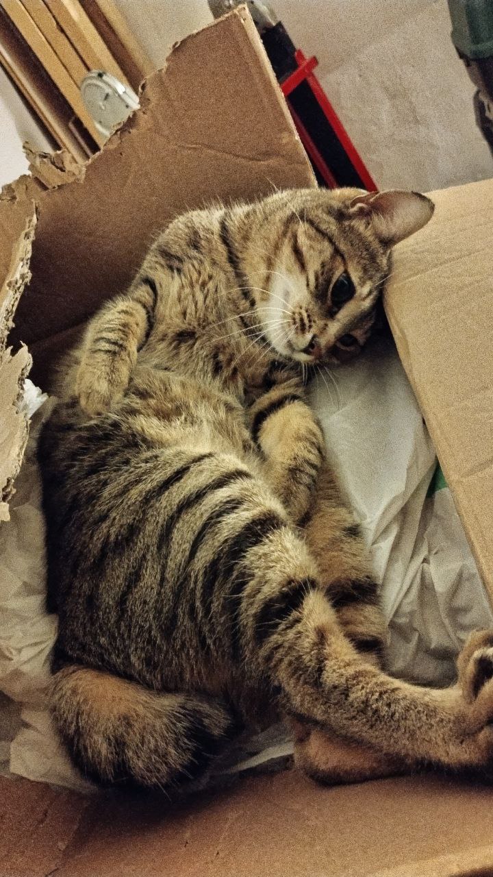 Perchè ci piacciono tanto ? In primo luogo perchè sono un buon nascondiglio : non dimenticate che noi gatti siamo dei predatori e in quanto tali siamo esperti negli agguati per acchiappare le nostre prede. Una scatola di cartone è un buon nascondiglio all’interno di un appartamento, e non solo per studiare tattiche di agguato ma anche per sfuggire allo stress. Brikka in questo senso è un fulgido esempio : quando non vuole essere disturbata da umani e felini, corre a rintanarsi nella sua scatola, tutta mordicchiata, di cartone.