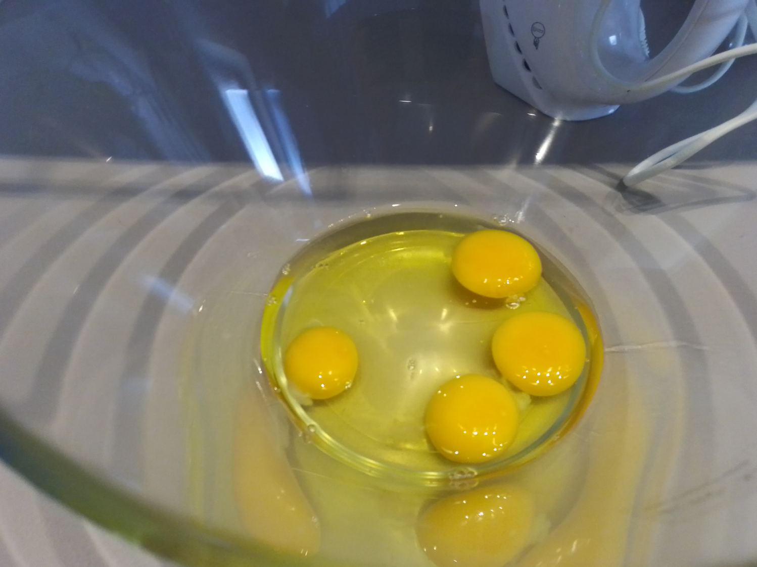 Nel succo di arancia, mettiamo a mollo l’uvetta, in modo che si ammorbidisca; rompiamo le 4 uova e con l’aiuto delle fruste elettriche le sbattiamo
