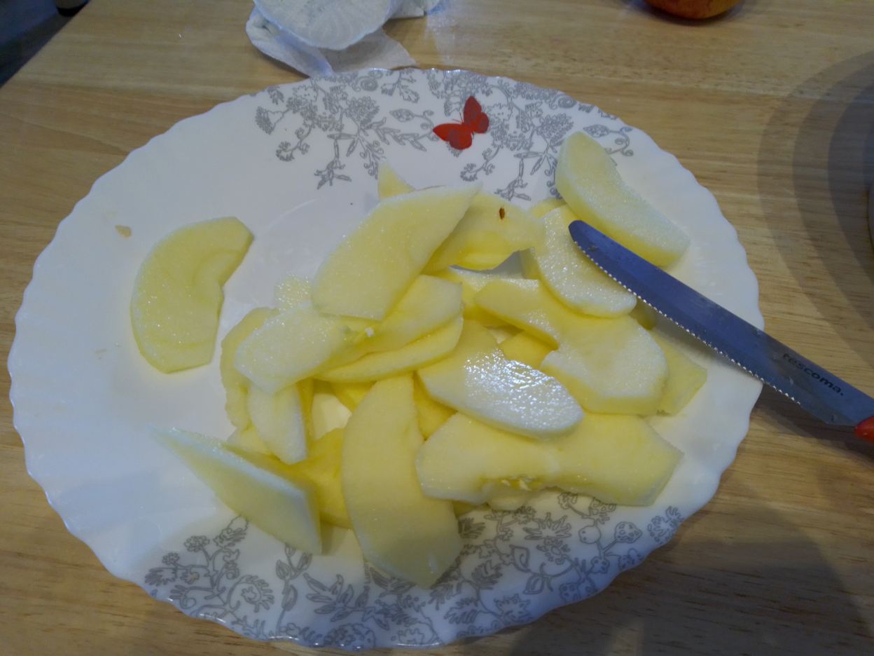 Sbucciamo le altre 2 mele e tagliamole a fettine e disponiamole in circolo fino a coprire tutta la superfice dell’impasto