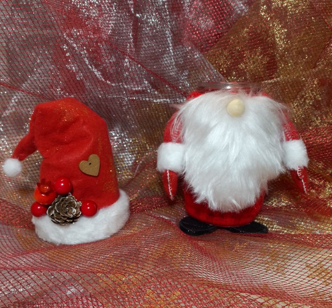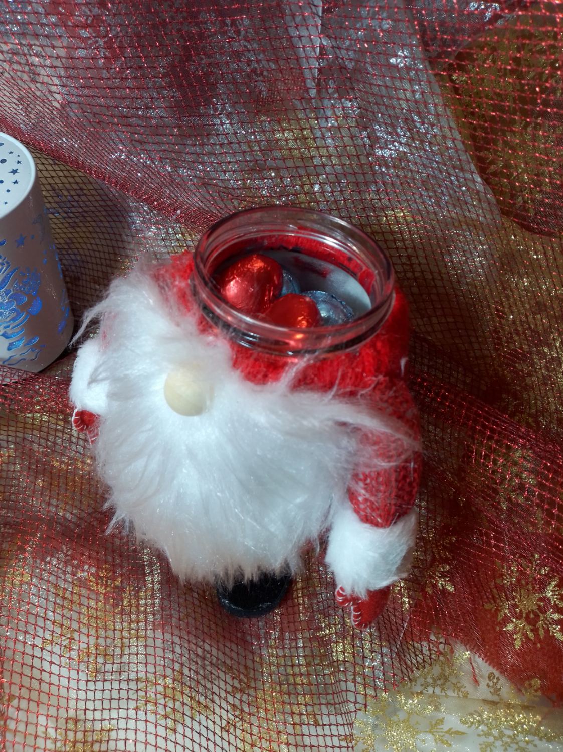 Salve a-mici !!! Qualche giorno fa è stato l’onomastico della nostra nonna umana, e la Sophie ha pensato per lei un regalo originale : ha riciclato un barattolo di vetro e lo ha trasformato in un Babbo Natale. Poi ha preso una confezione di cioccolatini e l’ha svuotata dentro il barattolo.