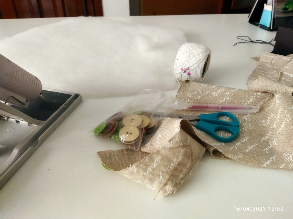 Occorrente : stoffa e bottoni che vi piacciono, colla a caldo, ago e filo, forbici, penna cancellabile o matita, imbottitura, un pò di pannolenci in tinta con il tessuto che avete scelto