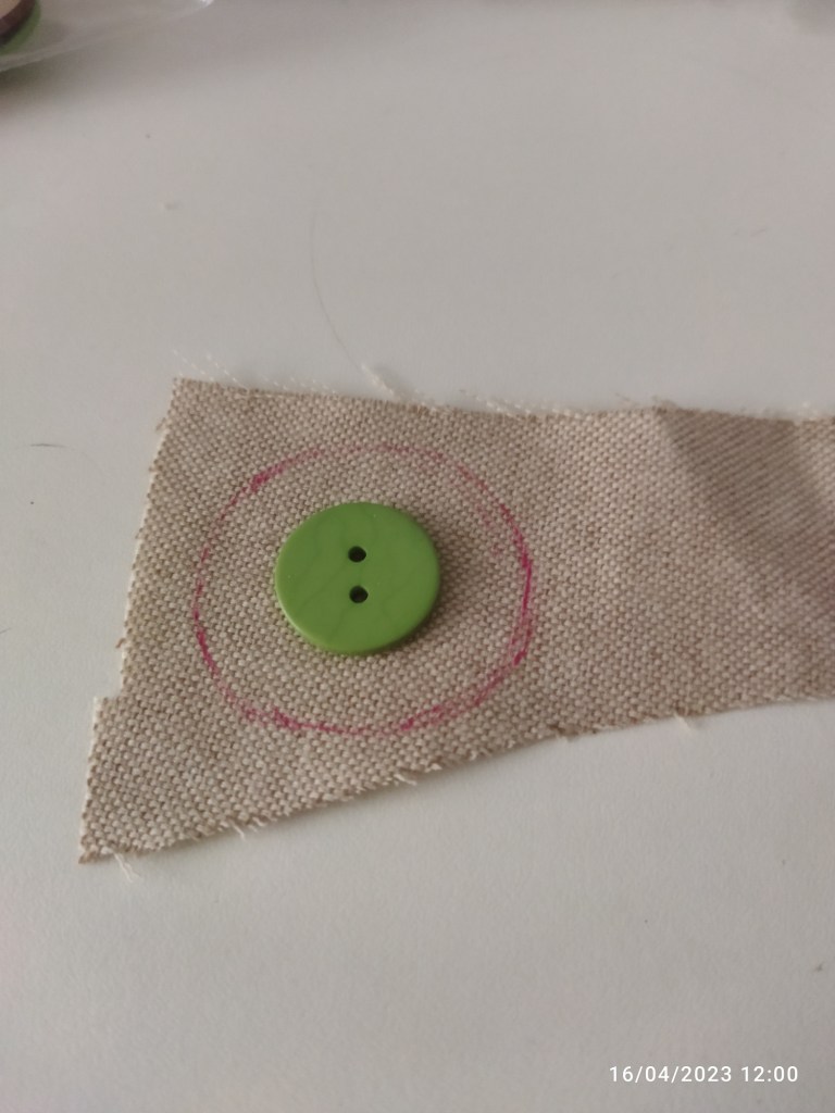 Con la penna o la matita disegnate intorno al bottone un cerchio di 1 cm più largo. Quindi ritagliate ed intorno al bordo della stoffa fate il punto filza con ago e filo.