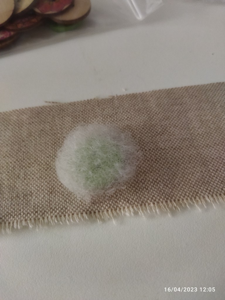 Dopo aver terminato il punto filza intono al pezzo di stoffa, tirate il filo in modo che il tessuto formi una specie di conchetta. Quindi incollate un pò di imbottitura su uno dei due lati del bottone