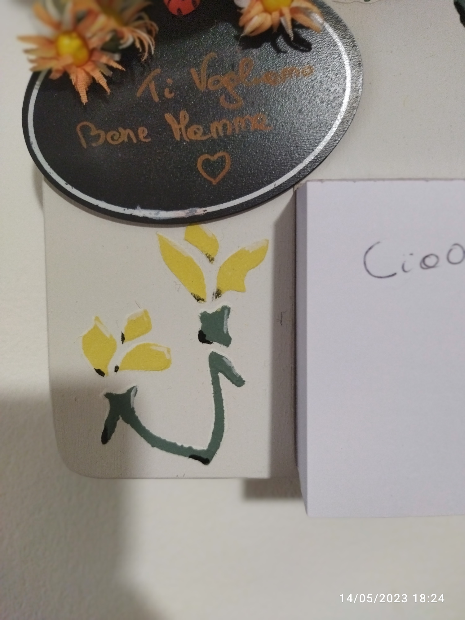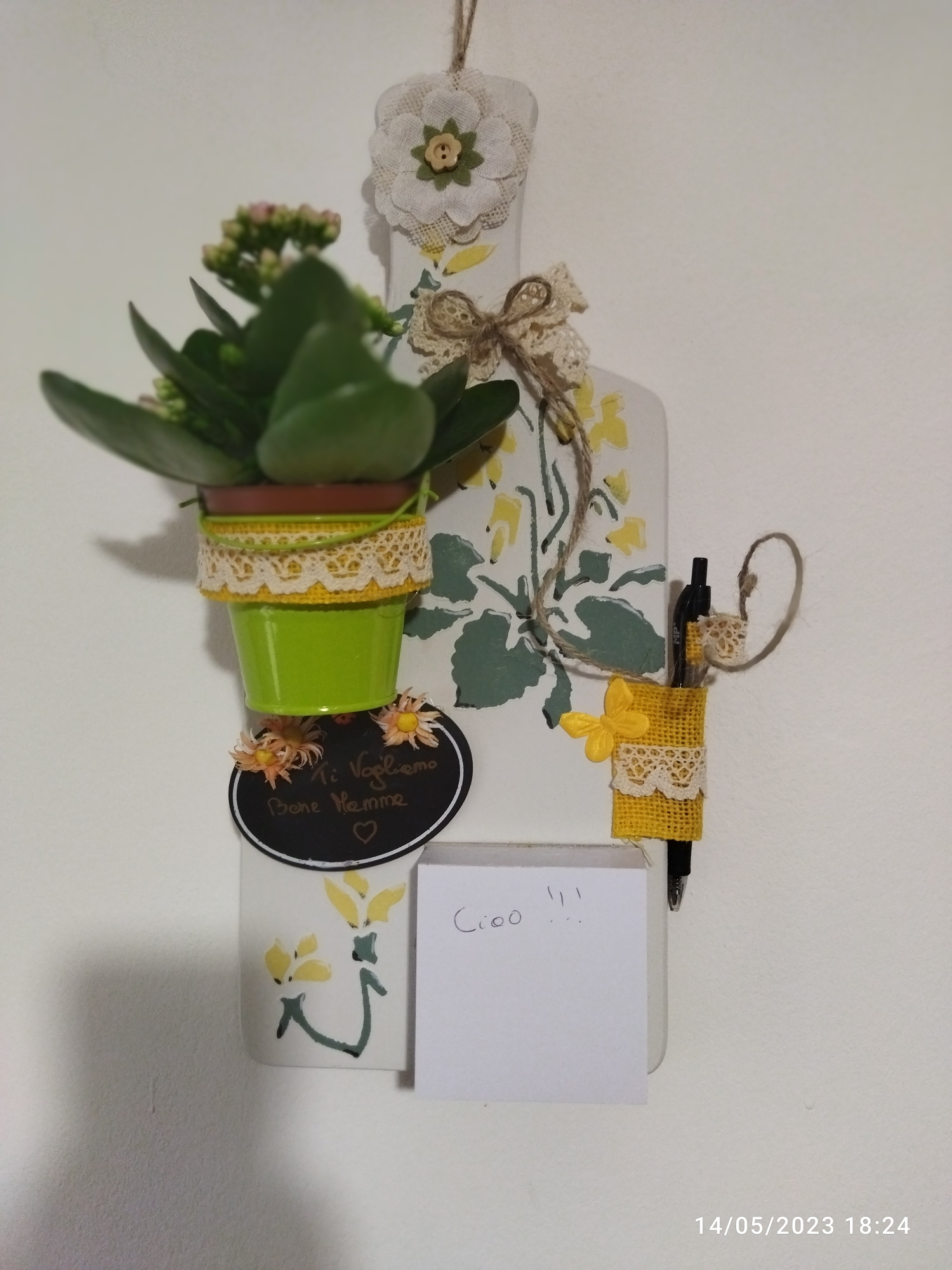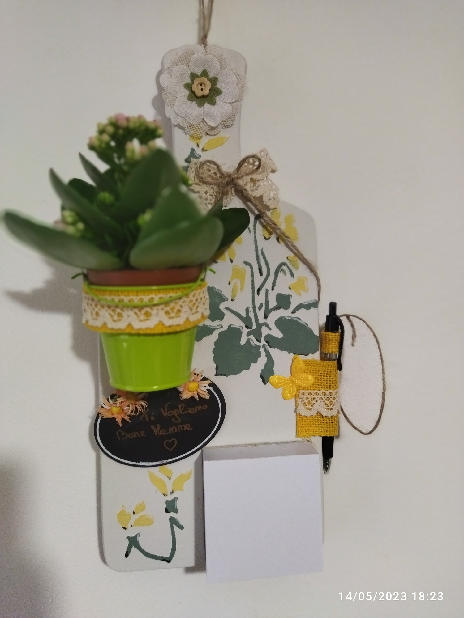E così ha tirato fuori questo bel blocco per appunti ricavato con un tagliere : davvero carino ! E devo dire che è tutto merito mio se c’è questa nuova creazione. Se non avessi strigliato la Sophie, non si sarebbe rimesse a lavoro e naturalmente visto che non riesce a staccarsi dalle sue pitture a gesso , le ha infilate anche in questa creazione!!! E a giorni lo metteremo in vendita su Misshobby … naturalmente la piantina non è compresa !!!