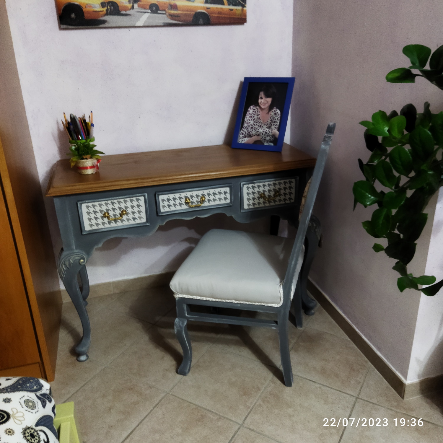 Salve a-mici !!! Il caldo rallenta la voglia di dedicarsi ai propri Hobby, e ispira solo la necessità di stare sdraiati vicino ad un ventilatore…. Nonostante questo però, sono riuscita a finire la sedia intarsiata (vi ricordate ?! dovevo completare la seduta) e a sistemarla vicino al suo scrittoio…. Sono un’amore, una coppia vincente ed indissolubile !!!