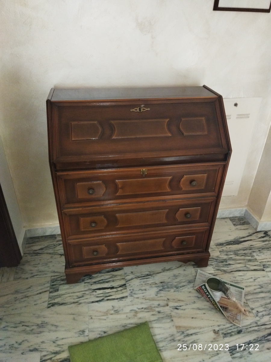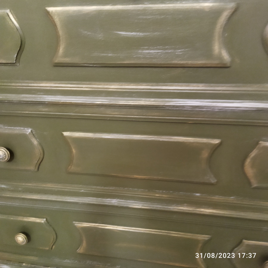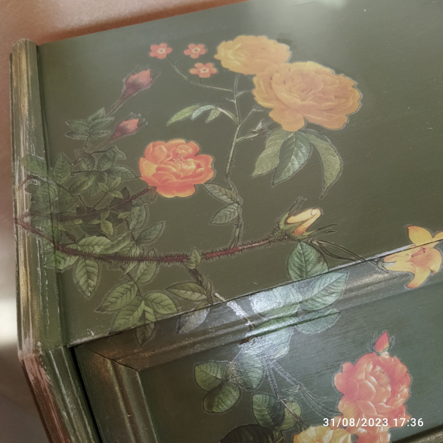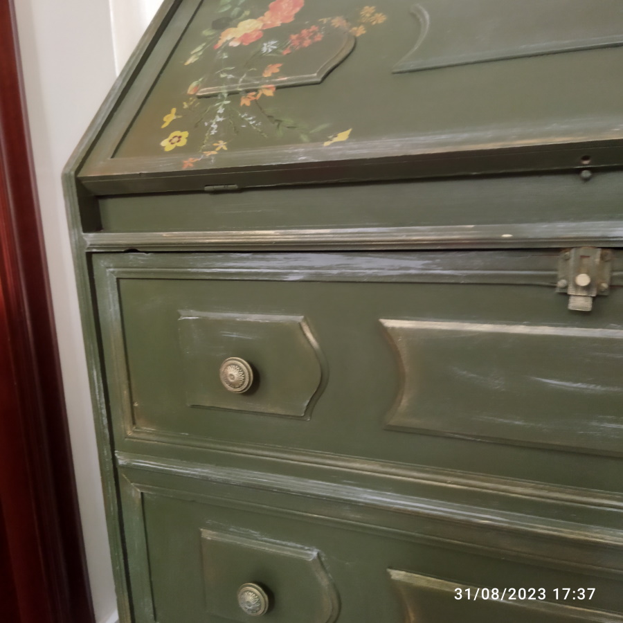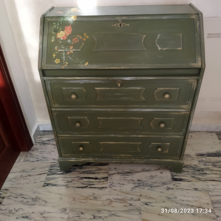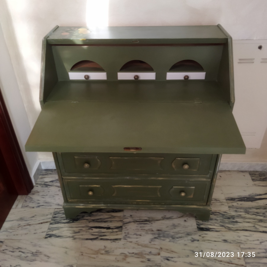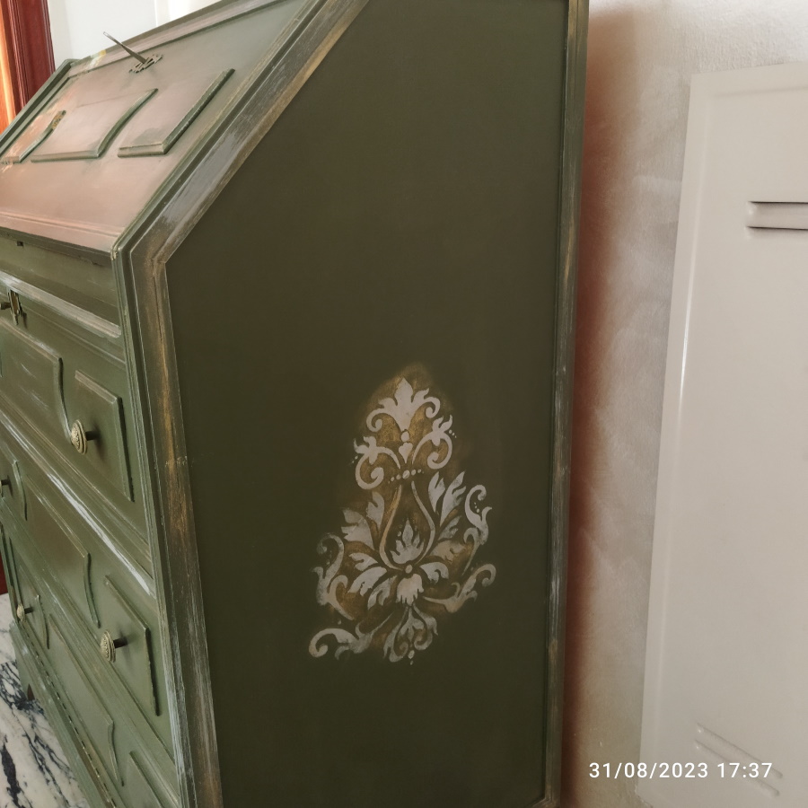 E’ uno di quei mobili anni 80 che ricopiano lo stile dei vecchi mobili, fatto con materiale scadente e di un colore noce scuro che lo rendeva anonimo e più brutto di quanto già non fosse. In origine era un mobile letto con scrittoio : il mobile letto chissà che fine ha fatto e lo scrittoio deve essere stato così usato che il legno al suo interno era rovinato. La Sophie però lo ha fatto rinascere : un bel colore caldo (verde oliva), un dry brush con i toni di un grigio pietra elegantissimo, un leggera anticatura con una cera dorata e per ultimo i transfer per mobili, ed ecco rinato un mobile che francamente non aveva nulla da dire. Ora durante le nostre scorrazzate mattutine nelle scale ci fermiamo a guardarlo ammirate e incredule.