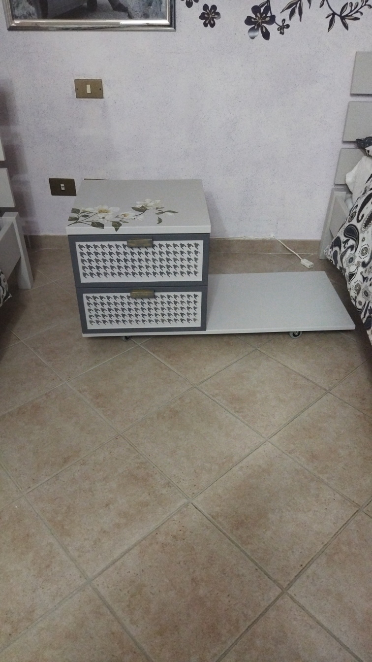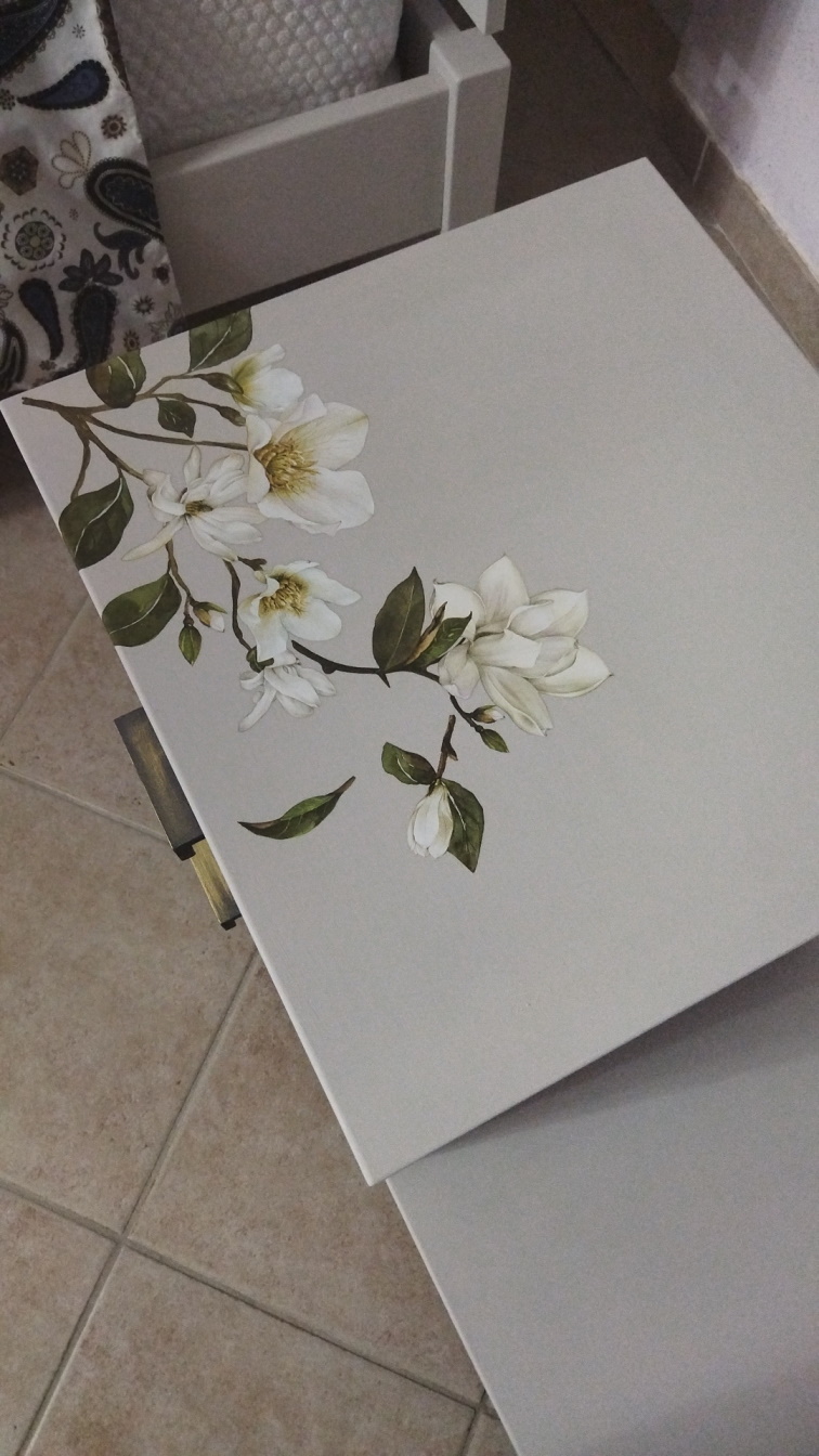 Salve a-mici !!!! E finalmente ho completato il restyling della camera degli ospiti !!! Anche il comodino e la cassettiera di Ikea, hanno un nuova veste e sono perfettamente intonati per stile e colore con il resto dei complementi. Sono partita con il solito grigio pietra su tutta la struttura dei due mobile e sulla parte centrale delle ante dei cassetti. Invece la cornice e la decorazione dei frontali l’ho fatto con un bel grigio fumo tendente all’azzurro, così come le maniglie che ho poi “sporcato” con della cera dorata. Per completare il lavoro un bel transfer a tema magnolia sulla parte superiore di comodino e cassettiera !