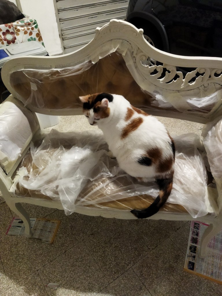 Così io e Milù abbiamo preso uno dei barattoli di colore della Sophie e abbiamo cominciato a pitturare il divanetto… io dico che possiamo fermarci qua e provare a venderlo, Milù invece sostiene che va fatto qualche altro lavoro per renderlo più appetibile….io non so da che parte cominciare e Milù ne sa meno di me…. non vorrei mai dover chiedere aiuto alla Sophie…..