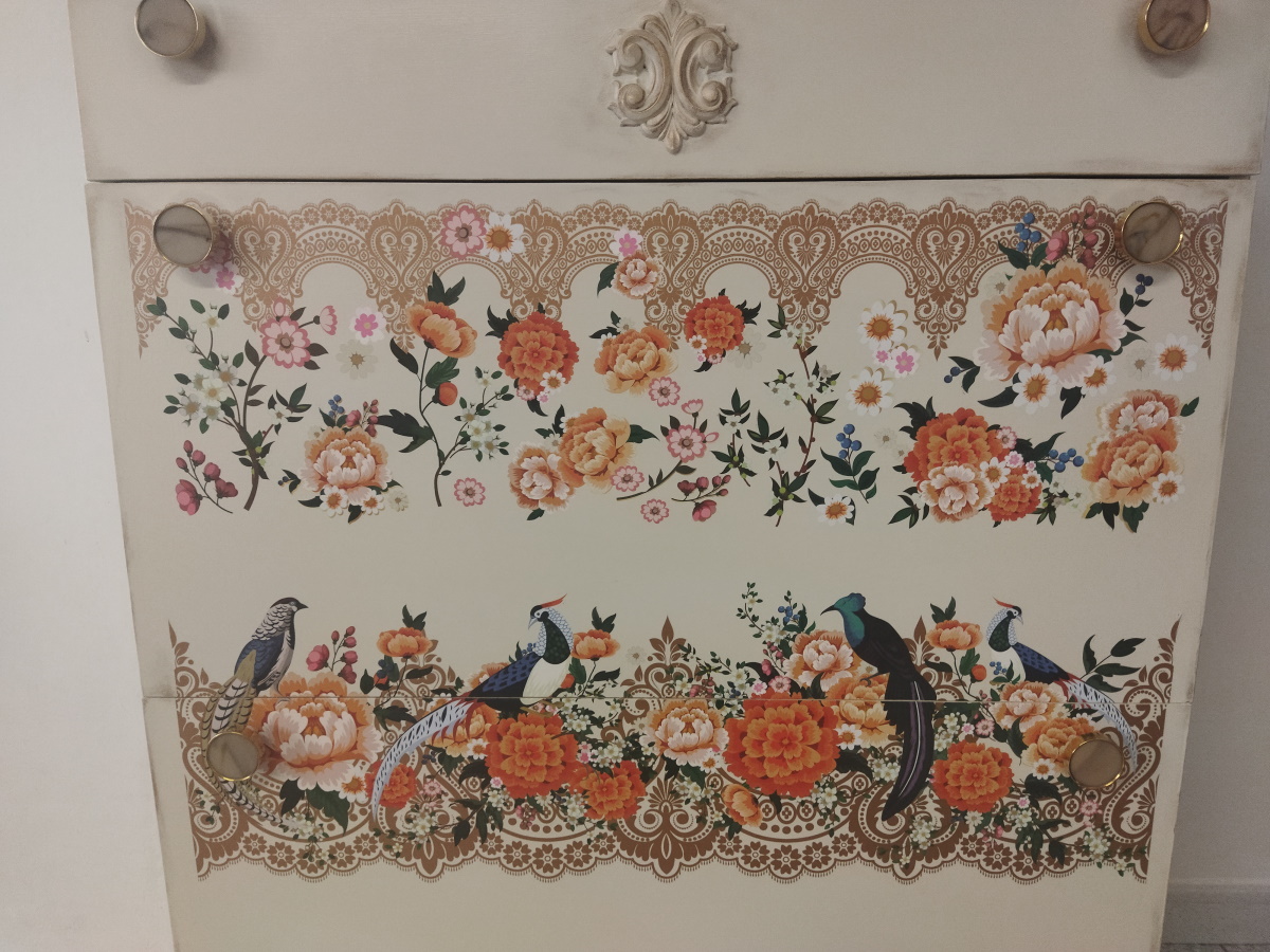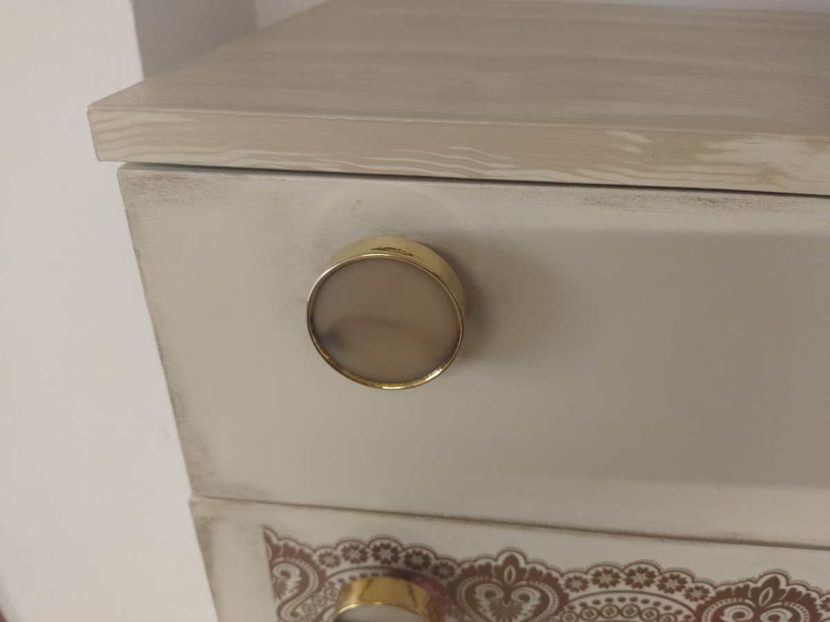 Sulla 2 ante ha applicato un transfer e sul cassetto un fregio in legno, anticando leggermente con una cera gli angoli di ante e il cassetto. Ultimo tocco : ha sostituito le maniglie e ha cambiato definitivamente volto ad un mobile vecchio ma funzionale.