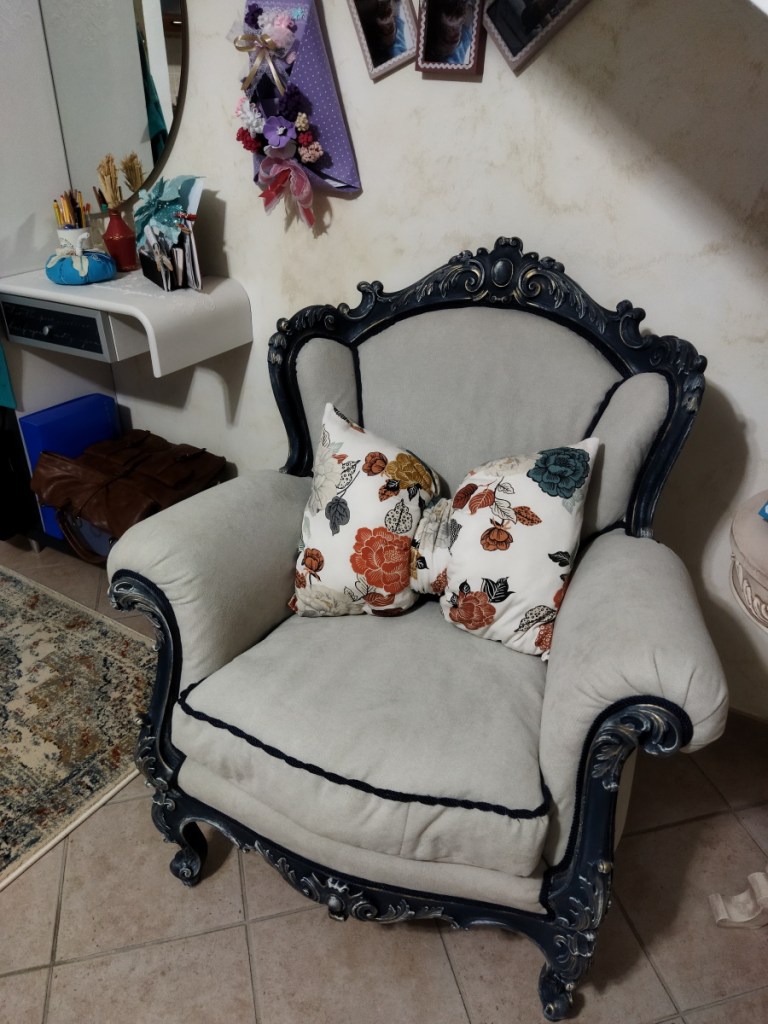 Poi sulla poltrona Sophie non sta niente male… diciamo che per essere la prima volta, me la sono cavata proprio bene. Ma diciamo che anche questo hobby non fa al caso mio : tenere premuto il pedale della macchina da cucire, prendere le misure precise per fare il cartamodello… insomma troppo stress e troppa fatica. Meglio pisolare nella mia cuccia morbida….. vorrà dire che dovrò dare fondo alla mia scorta segreta di crocchette …..