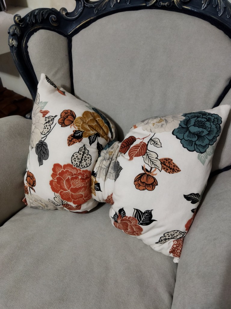 Questa settimana ho provato il cucito : ho preso in prestito la macchina da cucire semi giocattolo della Sophie e mi sono cimentata nella realizzazione di un cuscino a forma di fiocco. Devo dire che non è venuto male :