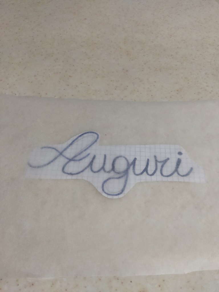 3. Se siete bravi, ma bravi bravi, potete scrivere direttamente sulla torta. Se invece siete poco pratici come me, allora preparate la scritta su un foglio di carta normale, o stampatela, se non avete una bella calligrafia. Fissate questo foglio sul piano di lavoro e ricopritelo con un foglio di carta forno, anche questo fissato sul piano. L’ideale sarebbe utilizzare un vassoio per poter poi spostare facilmente la scritta di cioccolato nel frigo. Quindi con la vostra “penna” fatta con la carta forno, con decisione e calma, ricopiate la scritta che vedete in trasparenza attraverso la carta forno. Fatta la scritta, lasciate che il cioccolato si solidifichi di nuovo. Più ripassate il cioccolato sulla scritta, più questa sarà spessa e quindi sarà poi più facile da staccare dalla carta forno un volta che il cioccolato si sarà solidificato, evitando che si rompa.