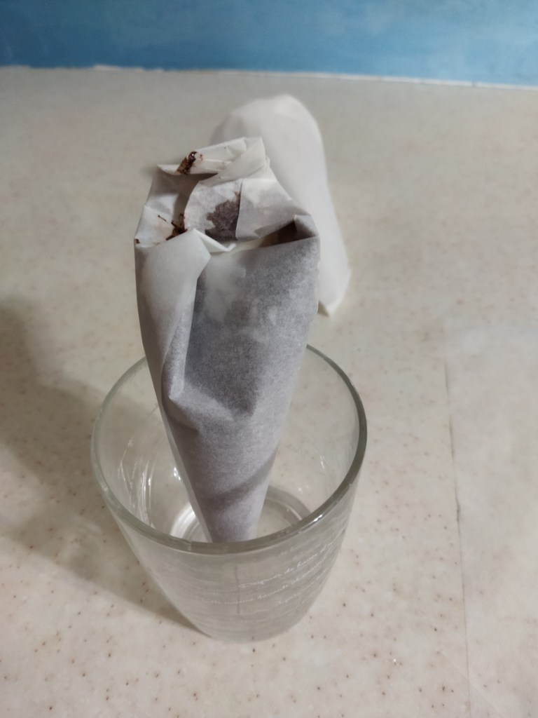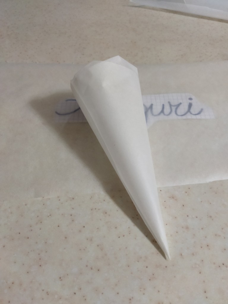 2. Prepariamo il cono con la carta forno, cono che utilizzeremo come sacapoche. E’ semplice : tagliate un triangolo, possibilmente equilatero, e avvolgetelo a cono, avendo cura che la punta sia chiusa. Bloccate il cono ripiegando i lembi della carta forno nella parte larga del cono, e poggiatelo in un bicchiere con la punta stretta in basso : riempitelo non oltre la metà, con il cioccolato, richiudete la parte superiore, e tagliate di poco, la punta. Tagliate quel tanto che basta per far uscire un filo sottile di cioccolato. Fate delle prove : se serve lo aprite un pò di più. Questo perchè dovete decidere voi quanto cioccolato far defluire e più l’ugello è stretto, e più è facile. Diversamente avrete una lava di cioccolato incontrollata che inonderà la vostra torta.