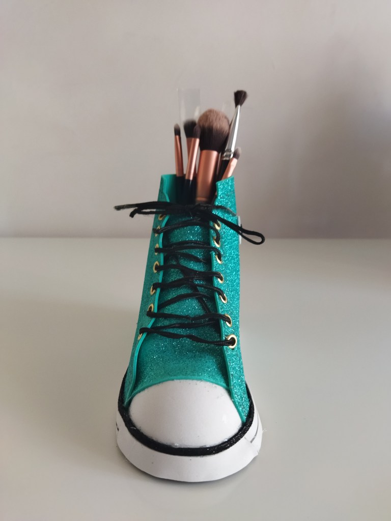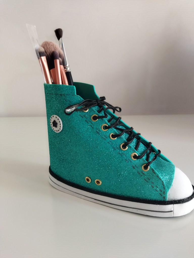 Passiamo poi agli oggetti in gomma eva: Sophie adora questo materiale così duttile, che si presta bene a dare forma alle idee creative della nostra art director. Realizziamo borse e scarpine di vari modelli utilizzabili come portachiavi, portaconfetti, regali di fine festa, oggetti decorativi, o addirittura, come l’ultima idea di Sophie, portapennelli, o portapenne (scarpa converse formato big). Cappellini, ne vedete uno indossato da me, portabicchieri in plastica, porta cioccolatini a forma di tazza. Una novità per questo inverno : per la linea “gatt a porter” le borse in gomma eva originali “Fatte da Brikka e Sophie“
