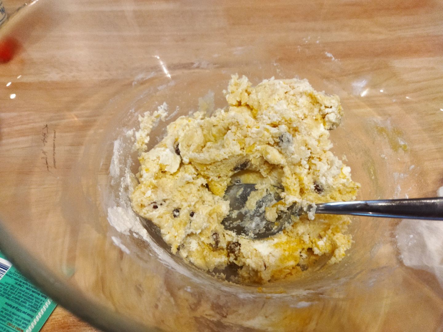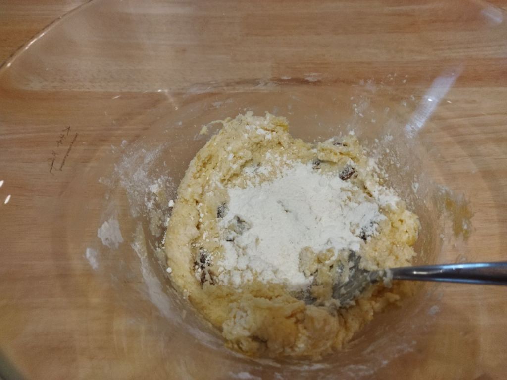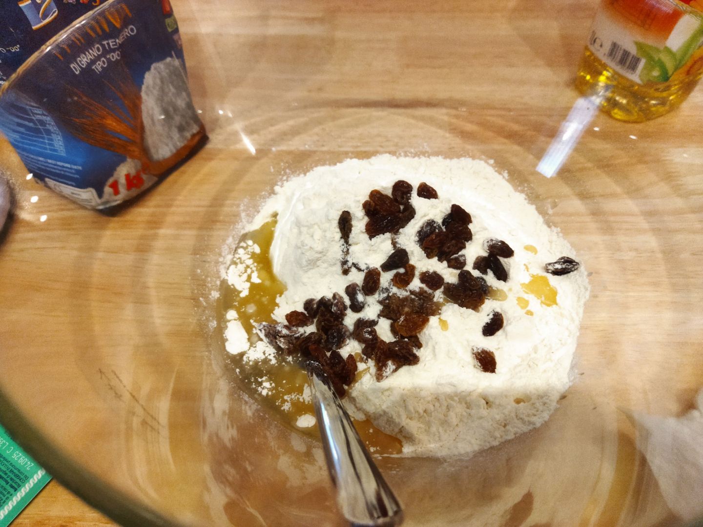 La consistenza che deve avere l’impasto è quella che vedete nella prima foto. Io in genere aggiungo anche il quinto vasetto. Aggiungo poi il lievito e dopo aver amalgamato quest’ultimo aggiungo 2/3 dell’uvetta dopo averla strizzata bene e amalgamo