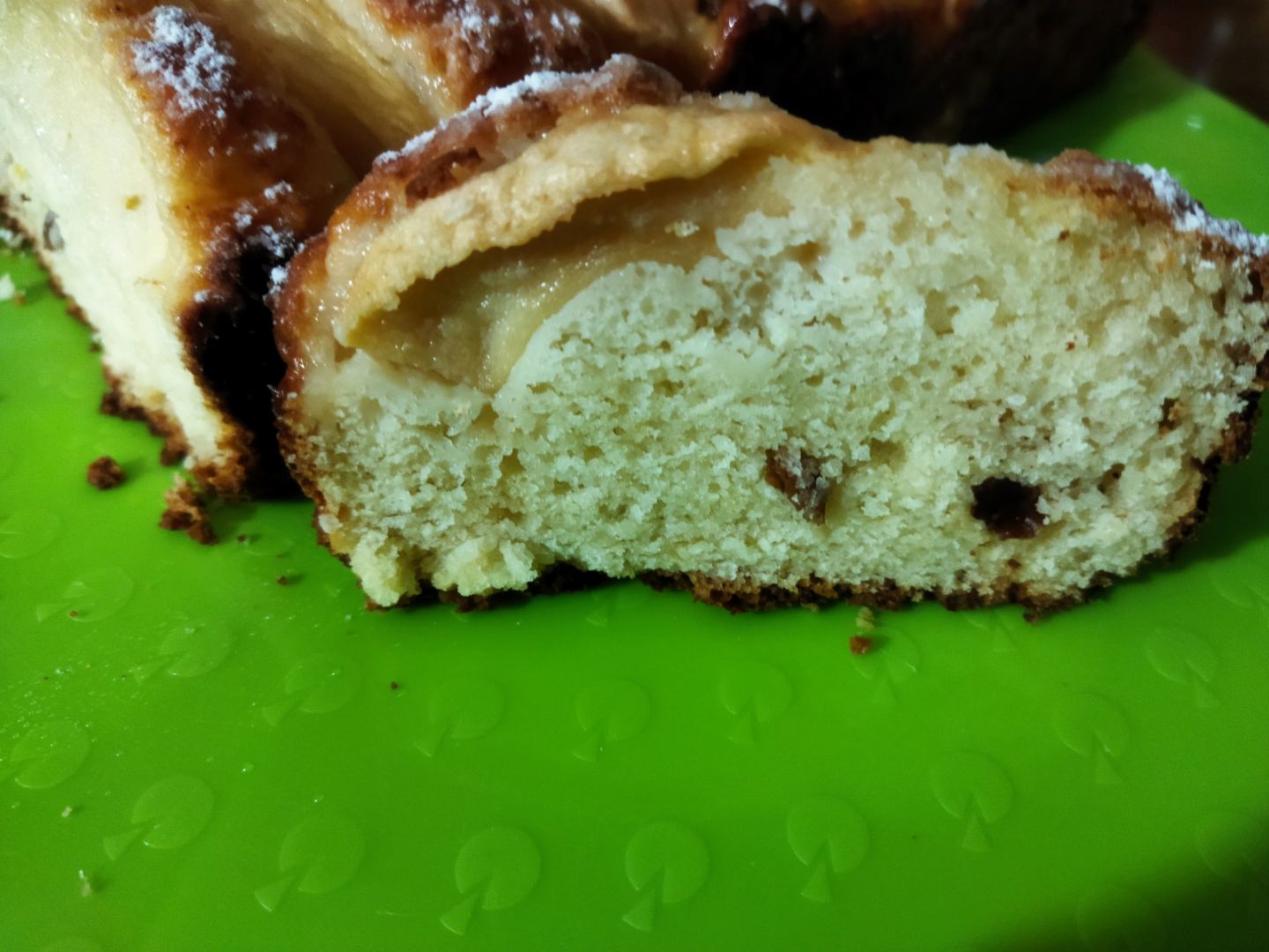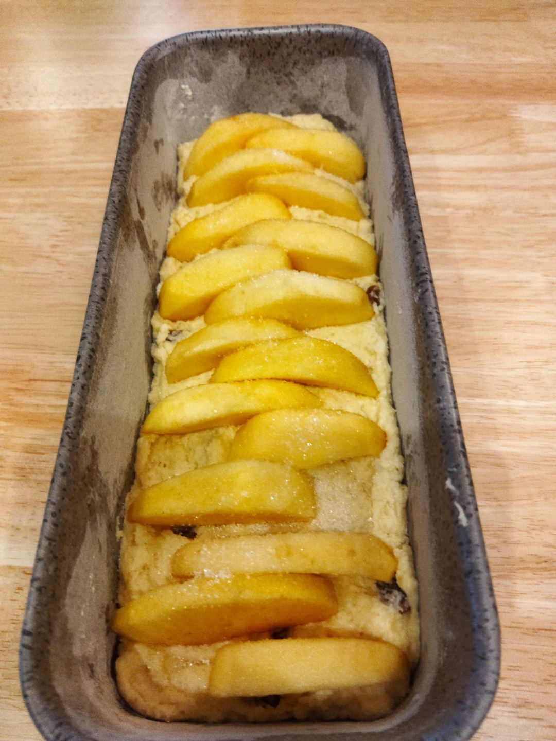 Sbucciamo e tagliamo a fettine sottili le mele e disponiamole sulla superficie dell’impasto aggiungendo anche il resto dell’uvetta e lo zucchero a granella