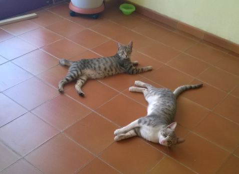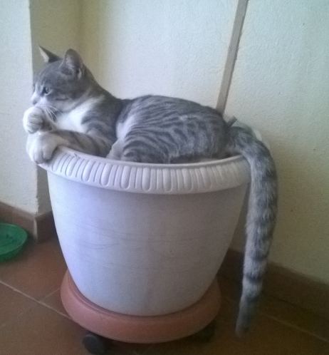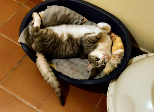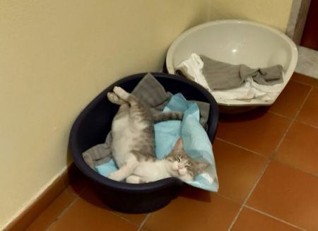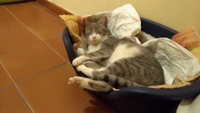 Arrivato in pieno autunno, inizialmente diffidente e pauroso, si è adattato presto alla sua nuova famiglia felina. E’ un coccolone, innamorato di Brikka, che naturalmente non lo degna di uno sguardo, per il momento. Essendo l’unico maschio dell’allegra brigata, pattuglia incessantemente il suo territorio quasi tutte le notti, per tenere lontani gatti malintenzionati, pronti a rubargli le crocchette e la cuccia. Mangia per tre gatti e con Milù fanno a gara a chi svuota prima la ciotola. La sua vita sarebbe molto tranquilla, se non fosse per Pablo, un gatto randagio sempre pronto a soffiargli la cuccia, il cibo e le gatte ! Ma questa è tutta un’altra storia che racconteremo un’altra volta.