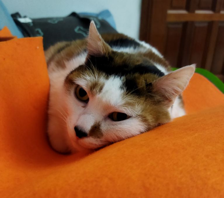 Ebbene : erano già due anni che io vivevo con la mia umana, che grazie a me, ogni volta che vedeva un gatto, andava in brodo di Giuggiole, convinta che tutti i gatti fossero strepitosi come me. Avevo il completo controllo dell’umana, della casa e di tutto il mondo fantastico e micioso che aveva creato per me. Le ciotole con il cibo erano sempre piene, dormivo dove volevo, in genere il letto di notte e il divano di giorno, fatta eccezione per le sedute di osservazione dalla finestra dove avevo un accogliente tiragraffi che mi aspettava. La mia vita insomma era perfetta ! Fino a che un pomeriggio di inizio autunno non mi accorgo, proprio durante una delle mie osservazioni alla finestra, di un fagottello bianco e rosso accucciato davanti ad un portone di fronte alla mia finestra. Guardo meglio e mi accorgo che era un gatto !!!! Fino a qui niente di grave, visto che aveva invaso il mio territorio, certo, ma ancora non rappresentava un pericolo per le mie ciotole. I problemi cominciarono quando la mia umana vide quel sacco peloso di pulci….. si precipitò fuori con delle ciotole di emergenza, anzi per la precisione, con le mie ciotole di emergenza, stracolme di crocchette profumate e carne in scatola di prima qualità. Figurarsi se quel gatto rozzo e sgraziato rifiutava l’offerta !!! Ci si fiondò di corsa !!! E da quel giorno, per circa due mesi, parte del mio cibo regolarmente lasciava la credenza per finire nelle ciotole, ormai non più mie, che sfamavano il profugo. Da dove fosse spuntato questo gatto era un mistero : l’unica certezza è che aveva imparato che quando sentiva tintinnare le chiavi di casa, correva dalla mia umana che lo faceva mangiare fino a farlo scoppiare. Inoltre, per convincerlo a restare aveva “apparecchiato” sotto il portico una specie di dormitorio-parco gioco per l’invasore, che si era scoperto essere una gatta, che puntualmente accettava l’invito. Il peggio però doveva ancora venire : una mattina di autunno una pioggia torrenziale si riversò sul quartiere : anche se quella plebea non mi era simpatica, non mi piaceva che stesse fuori al freddo sotto una pioggia battente. Anche perchè avevo capito che come gatto non ci sapeva fare : regolarmente le prendeva di santa ragione da tutti gli altri gatti del circondario che non si facevano certo scrupoli a picchiarla per impossessarsi delle crocchette. E così, quello che avevo temuto dal primo momento che l’avevo vista, si avverò : entrò nel mio regno !!!!! Ero furiosa con la mia umana e con l’intrusa… poi però quando l’ho vista bagnata, dormire su una cassettiera di plastica completamente immersa nel sonno ma serena, perchè sapeva che lì nessuno l’avrebbe picchiata, ho smesso di avercela con lei. Non era stata fortunata come me, e in fondo anche da quando c’era lei, avevo sempre mangiato a sazietà e mantenuto il mio status di Regina. La plebea poteva restare, a debita distanza da me……. non avevo obiezioni. Gli umani decisero di chiamarla Milù : io avrei optato per “svampita”. E’ una dolce dormigliona, che si comparta all’esatto opposto di come si comporterebbe un gatto. Vive per due cose : il cibo e il dolce dormire, anche se da quando è arrivata Isotta, pare che dorma un pò di meno. Dobbiamo tenerla costantemente a dieta ed è l’unico gatto al mondo che non “fa la pasta”.