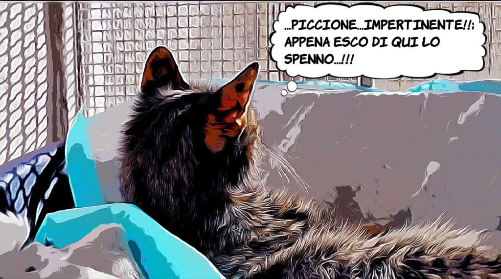 Salve a-mici !!! Brikka è stata portata in una zona dedicata della Tana, dove noi non la disturbiamo… essendo al momento invalida, reagisce male se uno di noi le si avvicina, e così gli umani le hanno sistemato l’attico sooooolo per lei. Adesso noi dei piani bassi, abbiamo più spazio e una cuccia libera…. ma devo essere sincera : non mi piace questa situazione. Rimpiango i tempi in cui con Brikka facevamo a gara per occupare la cuccia più comoda….