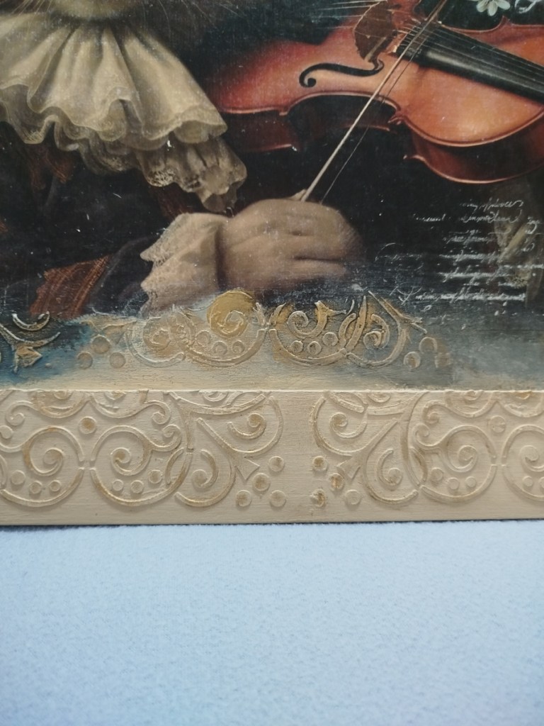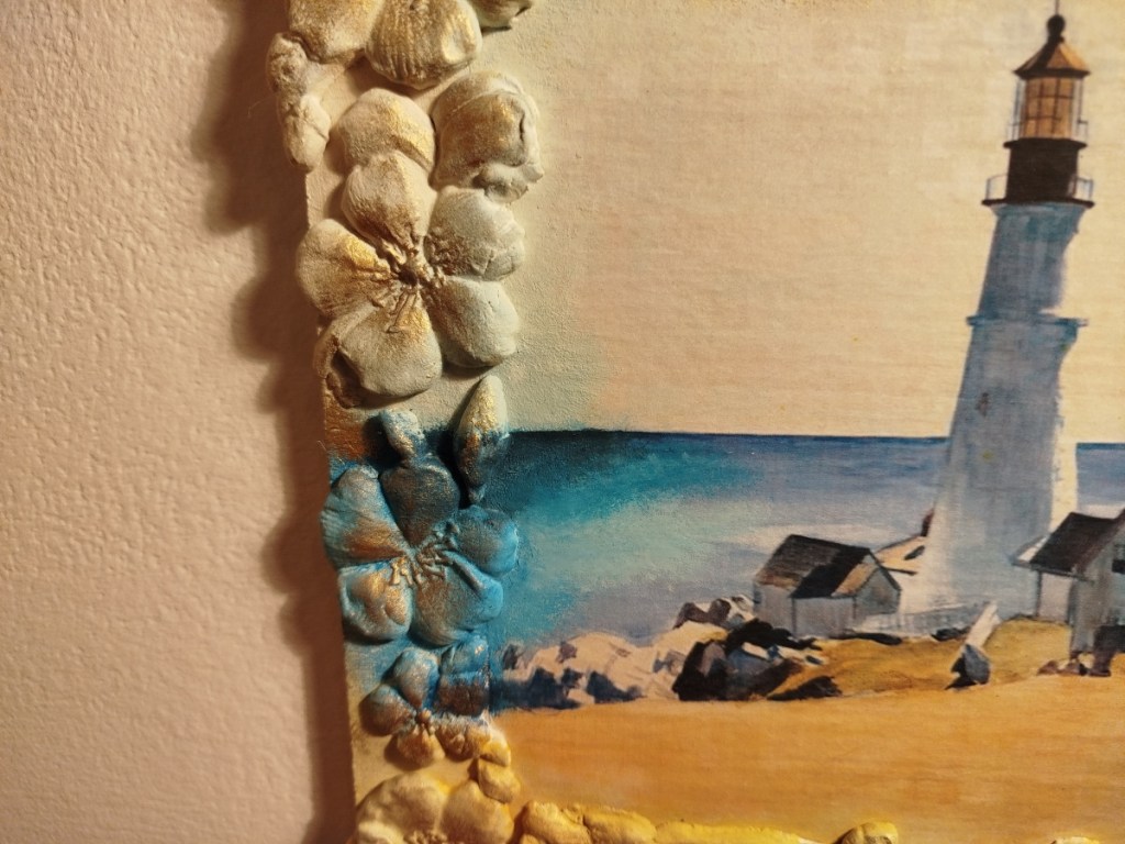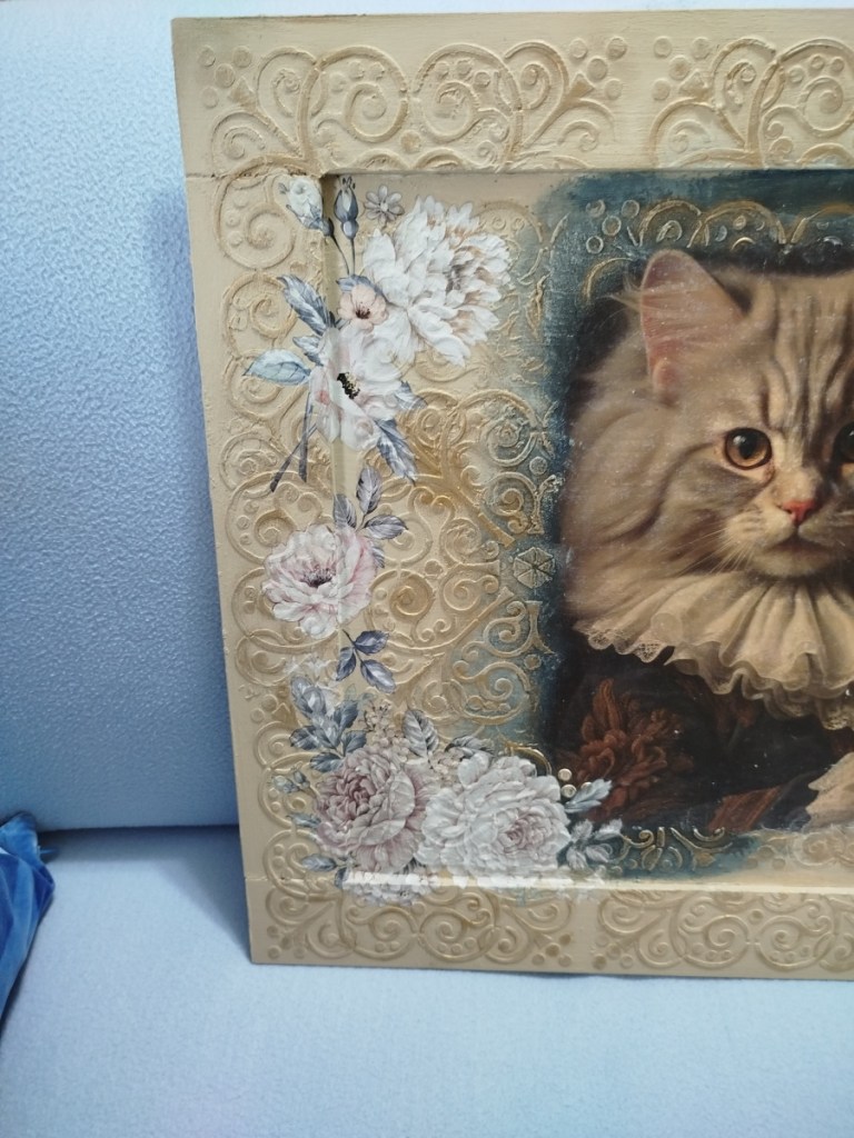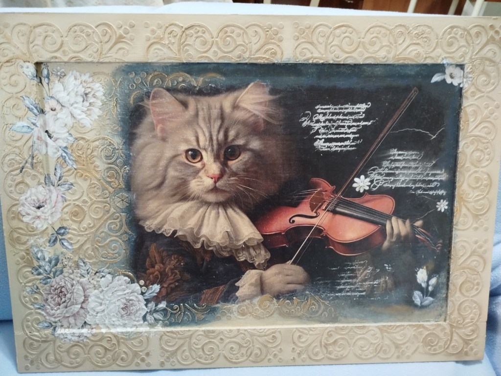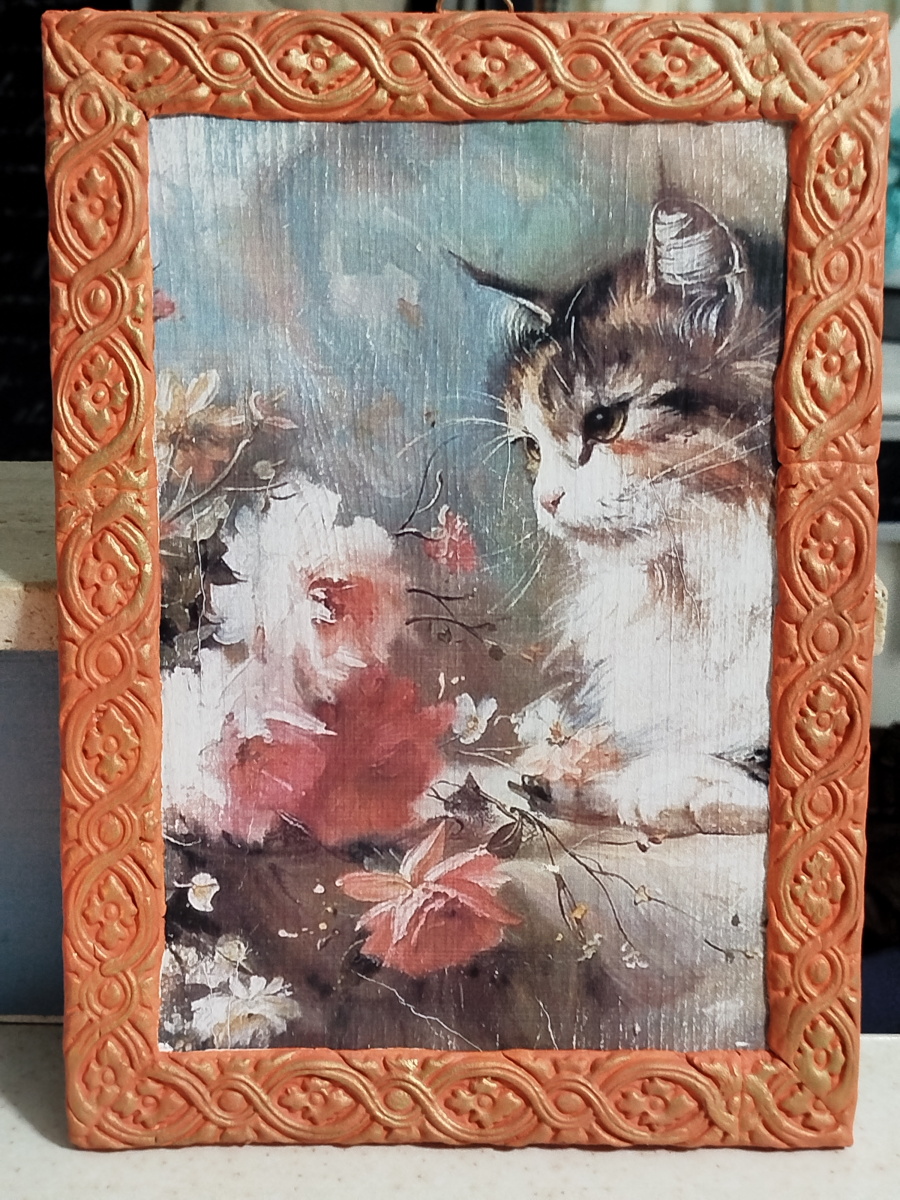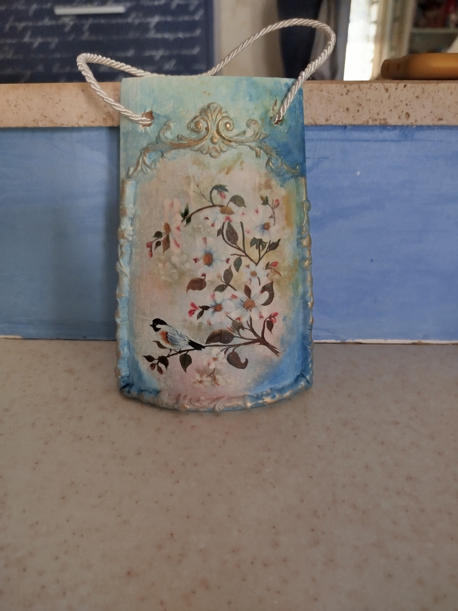 Ha realizzato su commissione questo quadro su tavoletta in legno : decoupage, DAS per cornice e la sua inseparabile Chalk Paint… niente male per essere il primo lavoro del 2025…