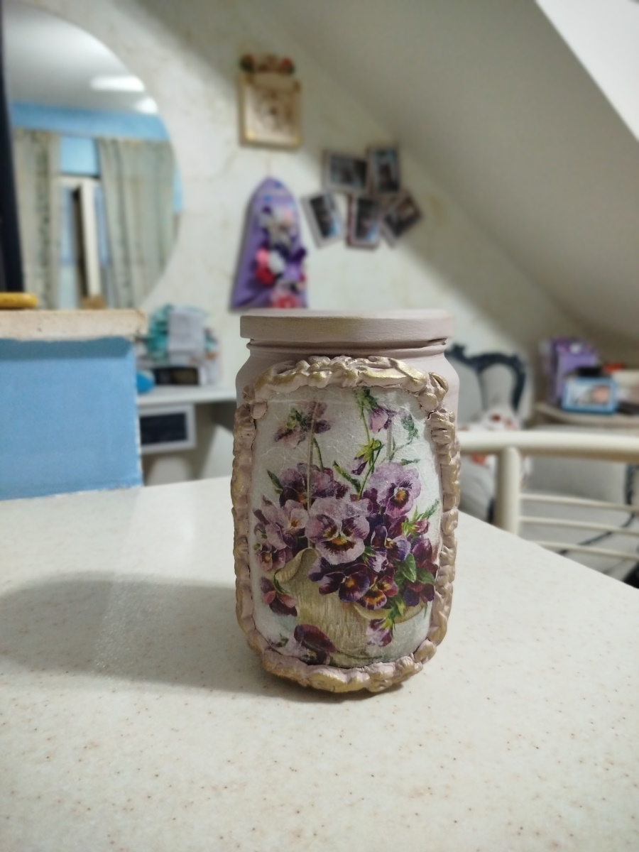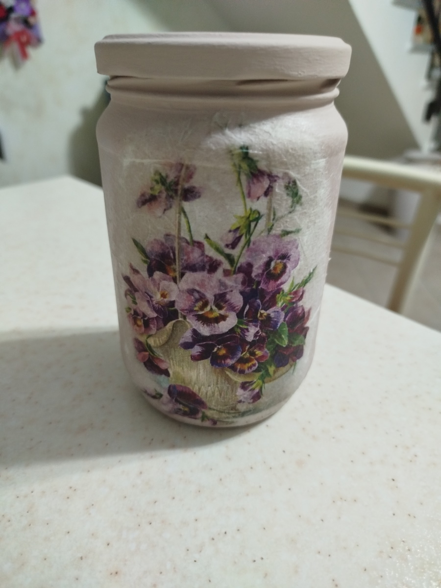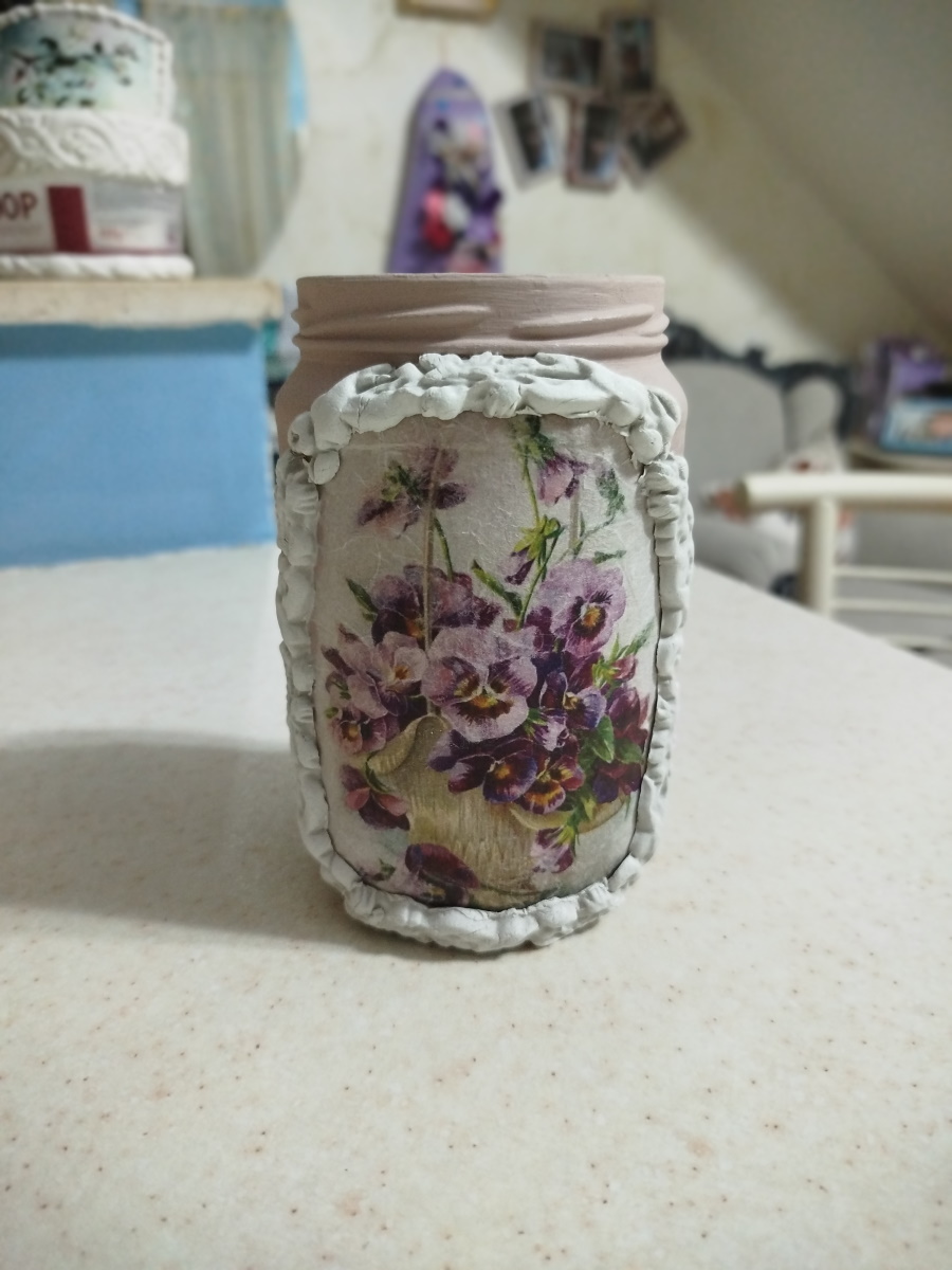 E così ho deciso di fare un decoupage su vetro…. cosa c’è di meglio di un barattolo da recuperare ?!!! Dopo avergli dato una mano di rosa antico molto chiaro con una chalk paint (e senza primer perchè quella che uso io attacca dappertutto, basta lavare e sgrassare bene la superficie ) ho attaccato con la colla da decoupage questo bel disegno su carta riso di un cesto di violette.. Poi ho fatto un bordo in das per incorniciare il disegno. Ad asciugatura completata, ho dato al bordo lo stesso colore del vaso. Ho chiuso con la cera neutra e poi ho passato la cera dorata sulla cornice. Niente male !