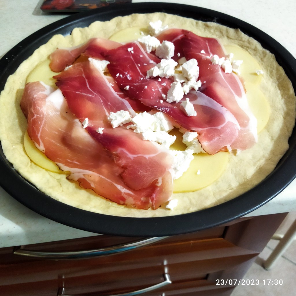 Stendete l’impasto all’interno della teglia, lavorando dal centro verso i bordi e fate lievitare per un altra oretta. Nel frattempo preparate il condimento : sbucciate 500 gr di cipolle, io ho usato quelle dolci bianche, ma potete usare anche quelle rosse, e ammorbiditele in una pentola con un filo di olio sul fondo ed una manciata di sale (salate a piacere). Fatele raffreddare prima di metterle sull’impasto.
