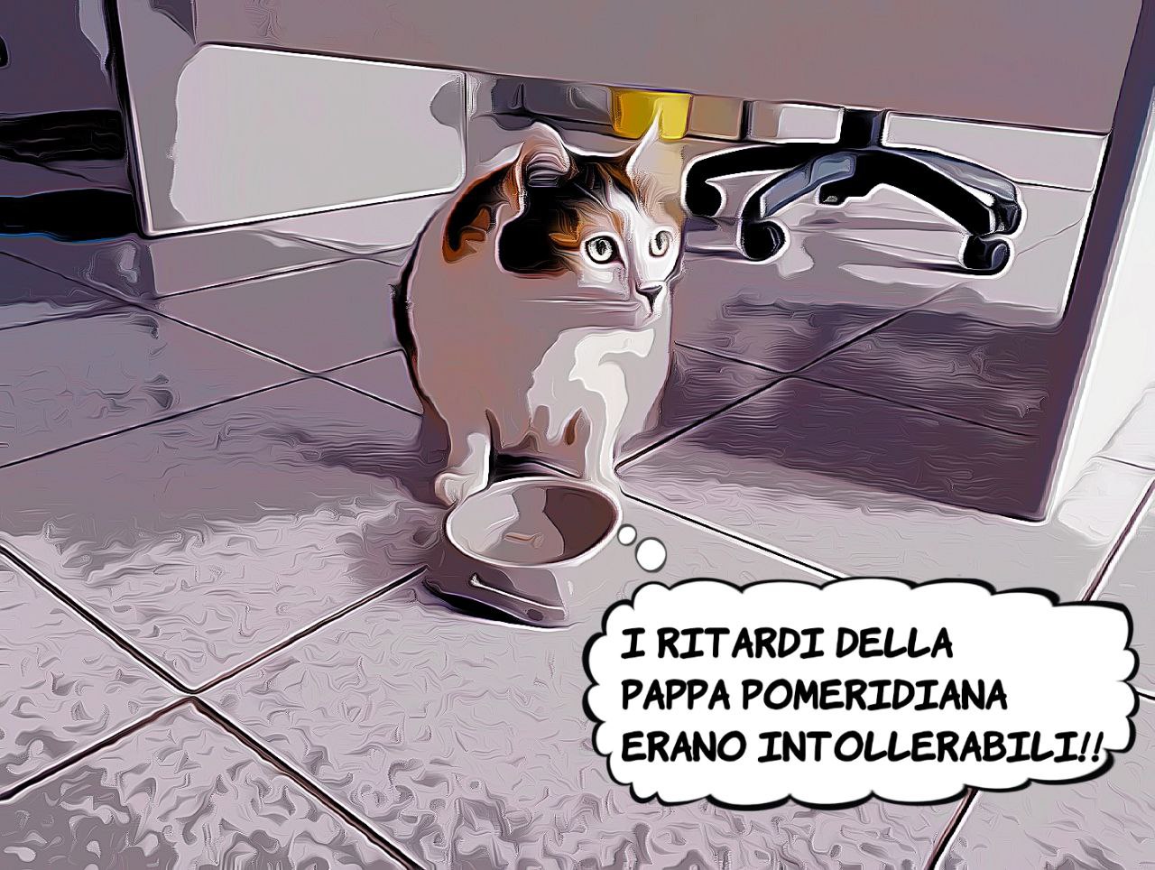 Salve a-mici!!! Dopo una settimana di vagabondaggio sono tornato alla Tana. E ho provato a chiedere a Brikka di cenare con me ma lei mi ha detto di no, perché per una settimana sono stato in giro dietro ad altre gatte. Ho provato a spiegarle che le altre nn contano nulla che io amo solo lei, anche se adesso è invalida, ma niente….mi ha respinto e mi ha invitato a leggere questo vecchio articolo….