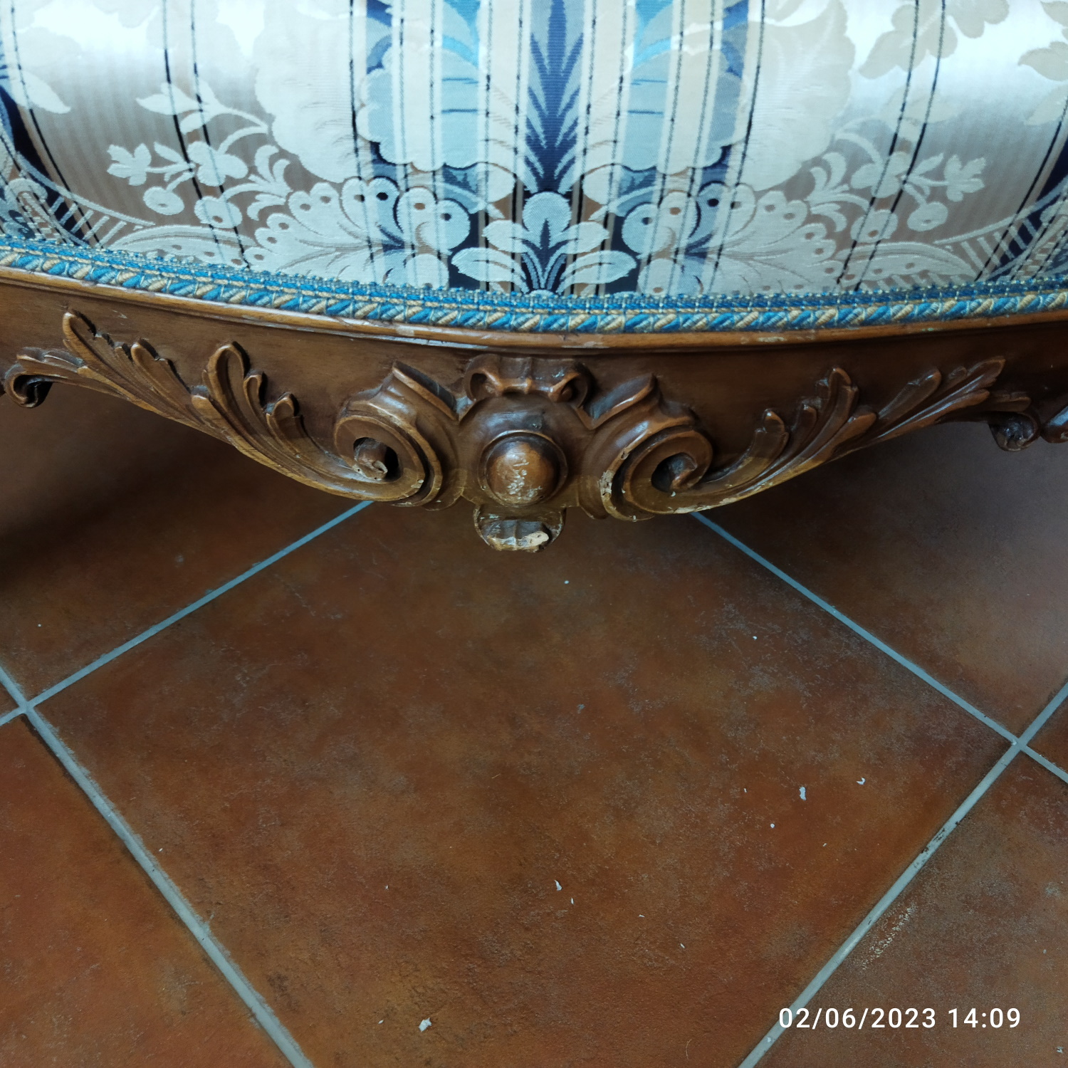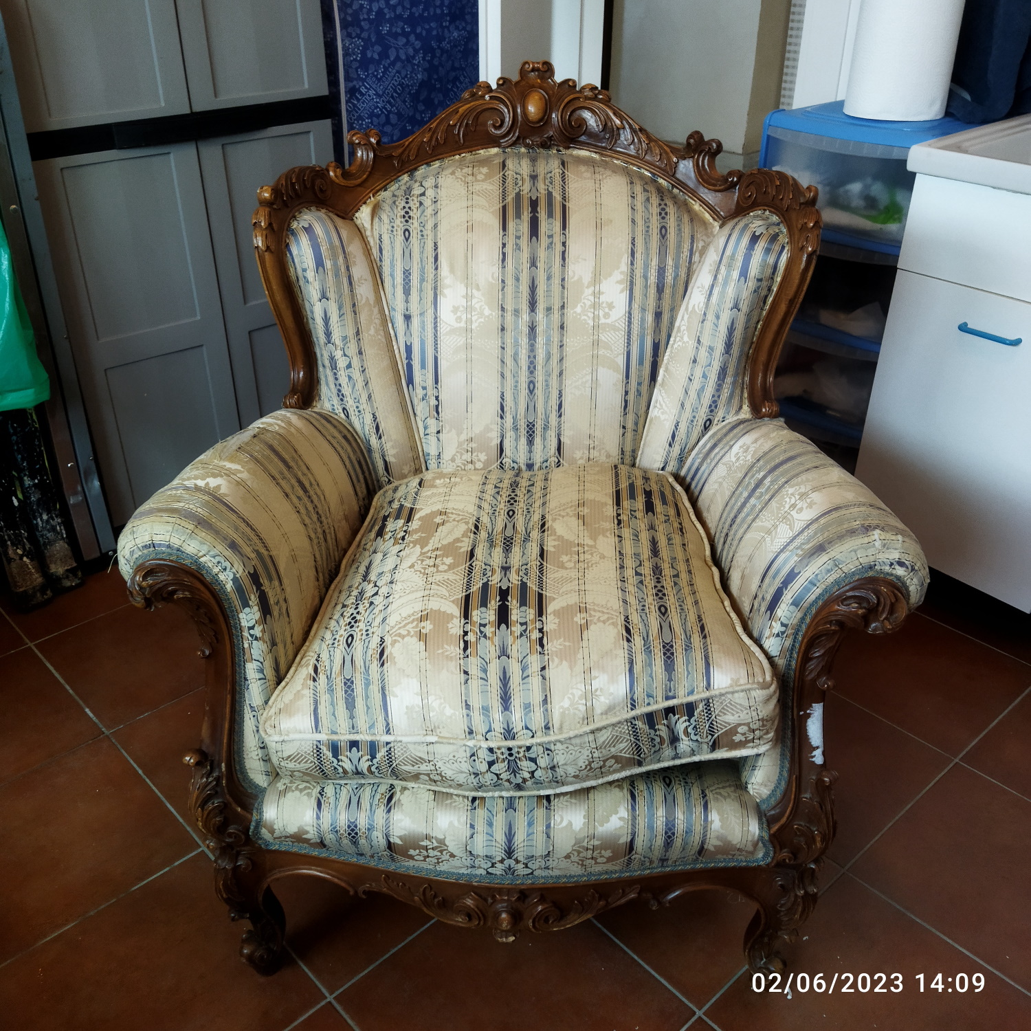 Salve a-mici !!! Finalmente la poltrona è stata completata e anche questa volta la Sophie è stata all’altezza della sua fama : quella poltrona vecchia, puzzolente, con i tarli, la tappezzeria e il legno rovinati, con le cinte della sedute in fase di distacco, è ritornata ad essere lo splendore che è stata in un tempo non molto lontano !