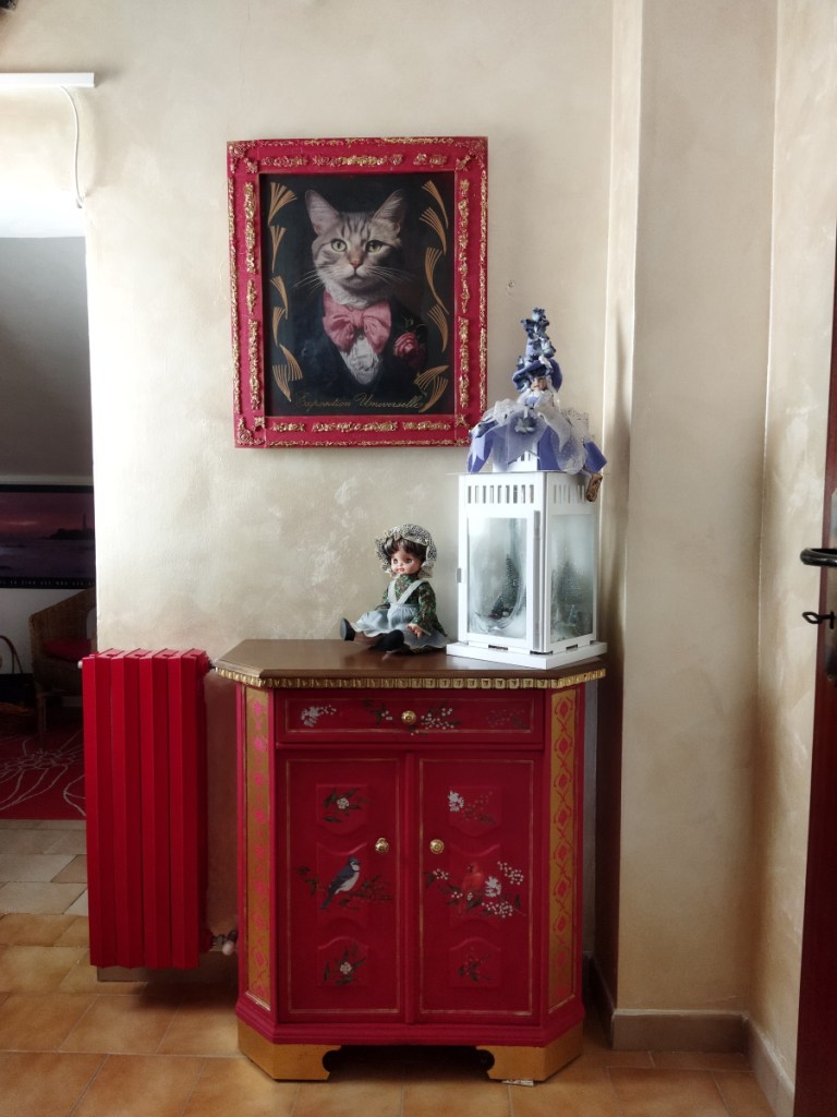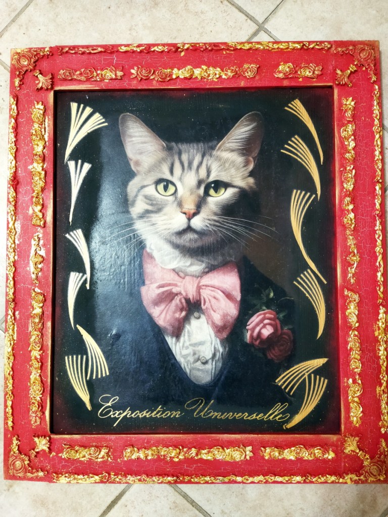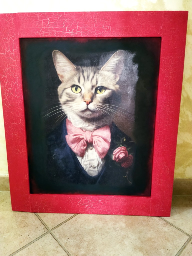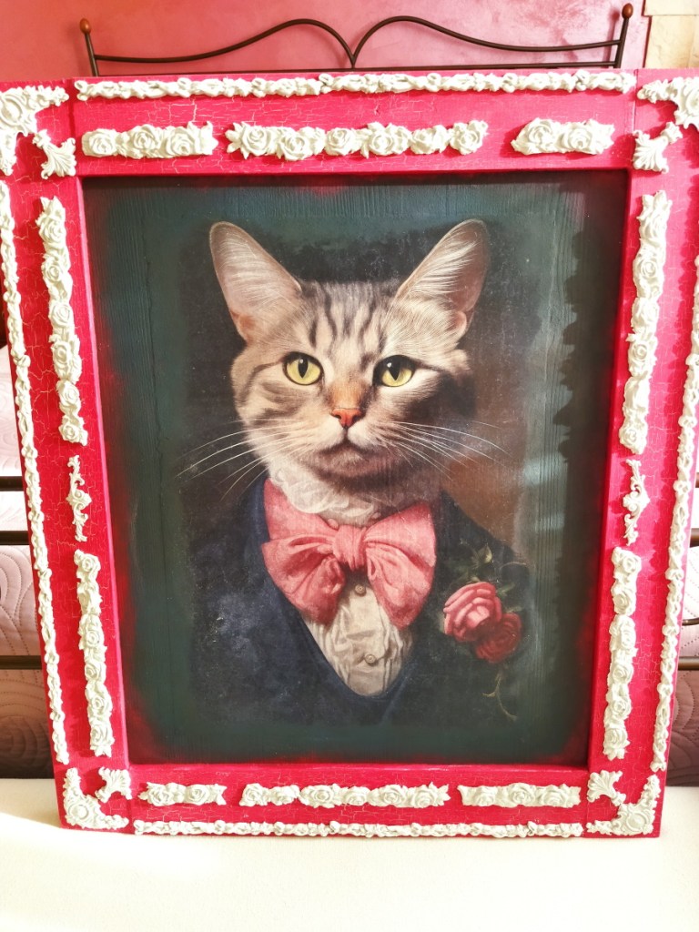Salve a-mici !!!! Ebbene si : un pò di riposo fa bene anche a me. In questa Tana di gatti matti, l’unica normale, cioè io, deve fare gli straordinari per rimediare a quello che gli altri non fanno. Se poi si aggiunge anche il fatto che sono molto impegnata con la mia attività , si spiega perchè a sera mi si chiudono i miei bellissimi occhioni verdi…. Ho appena finito di incorniciare uno dei dipinti che Brikka ha trovato nel sottotetto prima che lo trasformasse nel suo studio. Si tratta di Lord Le Chat, un tipo poco raccomandabile… sembra che trafficasse in contrabbando di crocchette all’erba gatta… ho fatto un ottimo lavoro !!! Questa volta alla cornice ho dato l’effetto craquelé prima di decorarla con dei fregi in DAS. Poi naturalmente foglia oro, così che il rosso che ho scelto per la cornice risalta ancora di più. Brikka mi ha chiesto di fare in modo da abbinarlo al mobile che ho restaurato qualche settimana fa…. a guardare bene il dipinto, Brikka somiglia tutta al suo antenato…. anche nelle marachelle che combina….