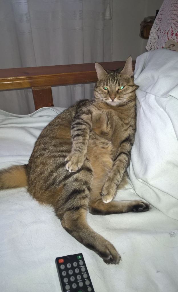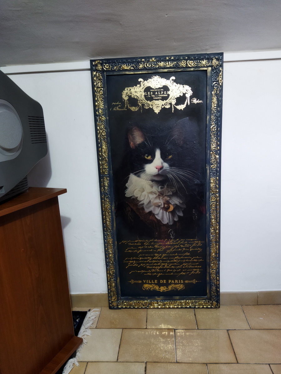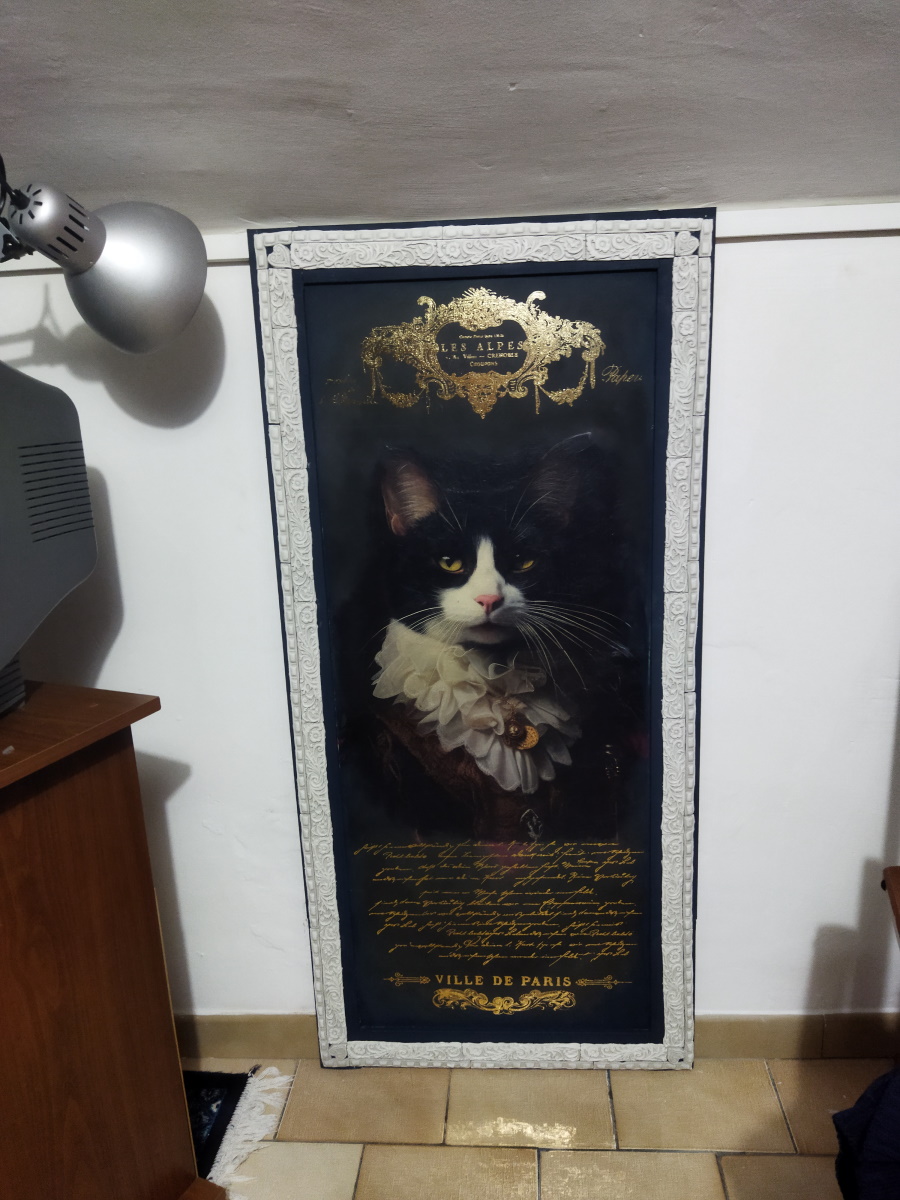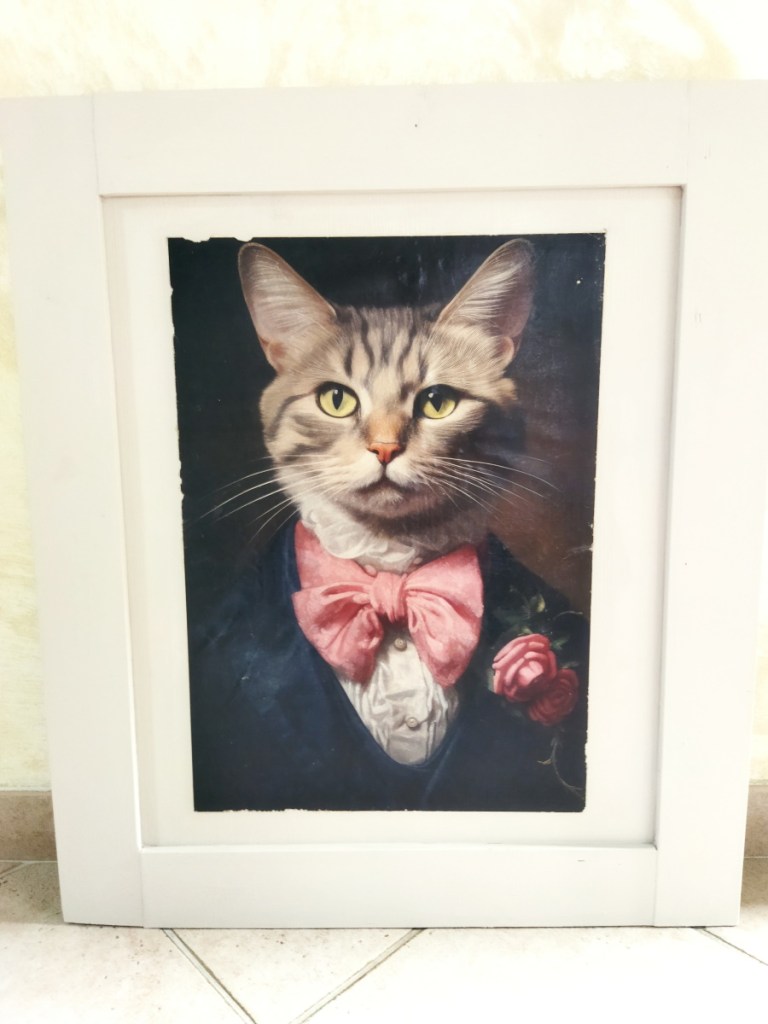 Salve a-mici !!!! Ebbene si : un pò di riposo fa bene anche a me. In questa Tana di gatti matti, l’unica normale, cioè io, deve fare gli straordinari per rimediare a quello che gli altri non fanno. Se poi si aggiunge anche il fatto che sono molto impegnata con la mia attività , si spiega perchè a sera mi si chiudono i miei bellissimi occhioni verdi…. Ho appena finito di incorniciare uno dei dipinti che Brikka ha trovato nel sottotetto prima che lo trasformasse nel suo studio. Si tratta di Lord Le Chat, un tipo poco raccomandabile… sembra che trafficasse in contrabbando di crocchette all’erba gatta… ho fatto un ottimo lavoro !!! Questa volta alla cornice ho dato l’effetto craquelé prima di decorarla con dei fregi in DAS. Poi naturalmente foglia oro, così che il rosso che ho scelto per la cornice risalta ancora di più. Brikka mi ha chiesto di fare in modo da abbinarlo al mobile che ho restaurato qualche settimana fa…. a guardare bene il dipinto, Brikka somiglia tutta al suo antenato…. anche nelle marachelle che combina….