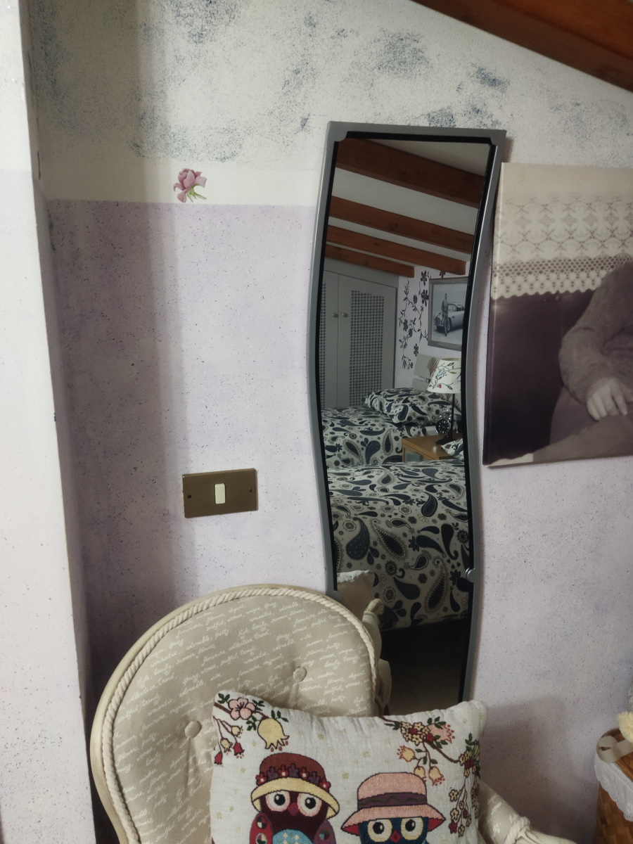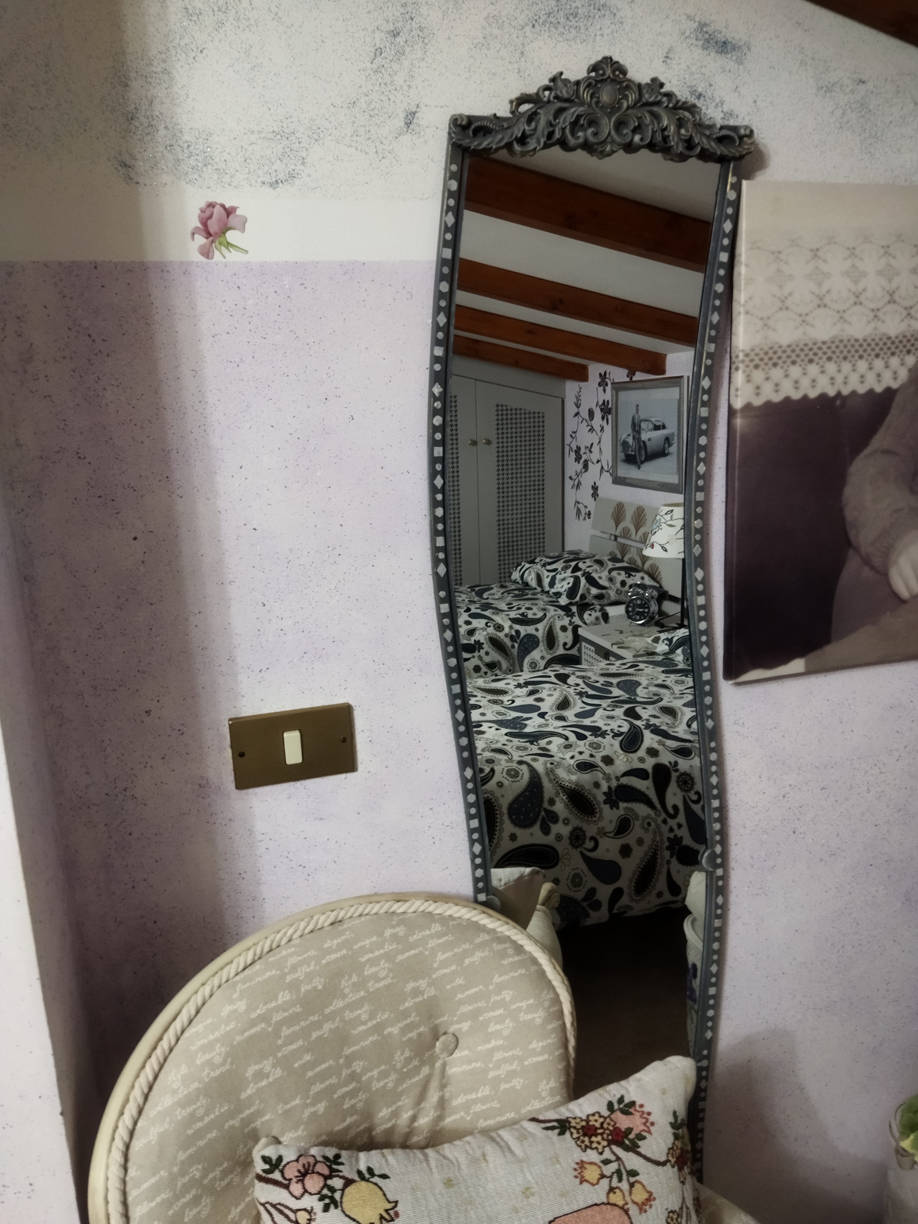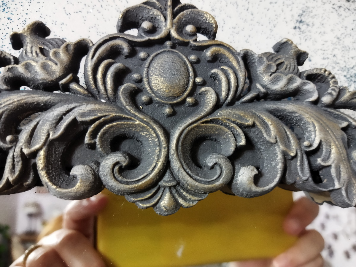 Salve a-mici !!! Mentre aspetto che mi venga consegnato il tessuto per tappezzare la poltroncina Milù, mi sono dedicata allo specchio della camera degli ospiti. Era l’ultimo oggetto da sistemare ed anche il più semplice. E’ uno specchio con la cornice, molto sottile, di plastica, anche rovinata in vari punti. Il colore che ho scelto è il grigio Isotta, quindi più scuro del suo colore originale. Nella parte superiore ho applicato un fregio in legno, mentre sui restanti 3 lati ho fatto uno stencil materico geometrico, molto piccolo, della misura giusta per la cornice.