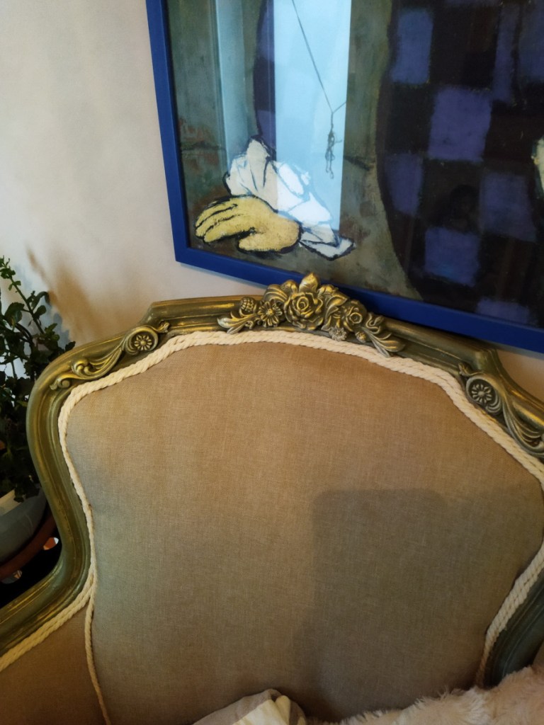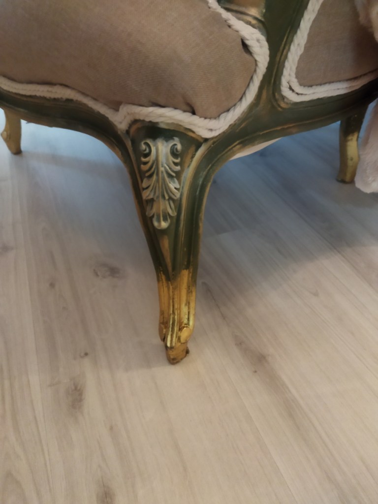 Salve a-mici !!! La mia poltroncina è pronta !!! Il ritorno di Sophie oltre a togliermi dalle spalle il carico di responsabilità come capotana, è servito anche a completare la mia poltroncina. Che dire : come al solito è un capolavoro !!! La Sophie l’ha rifatta integralmente : le ha sostituito le imbottiture, le telette di appoggio e rivestimento imbottiture, le ha aggiunto dei fregi che l’hanno resa più elegante e meno anonima. Come colore ha scelto un verde oliva sul quale ha poi fatto un dry brush molto leggero con un colore avorio. Il meglio della poltrona però sono i piedi su cui la Sophie ha usato la foglia oro, creando un effetto usura/invecchiato molto delicato ed elegante. Il rivestimento è sempre sulla tonalità del verde e come passamaneria, ha usato un cordonicino di colore avorio naturale, che le ha dato un tocco moderno. Manca solo il cuscino, ma a me va bene anche così ! C’è solo un problema : ora la Sophie non vuole che mi ci sieda sopra perchè sennò la riempio di peli !!! Insomma : la poltroncina è mia, ma non posso usarla. Ma che razza di regalo è ?????
