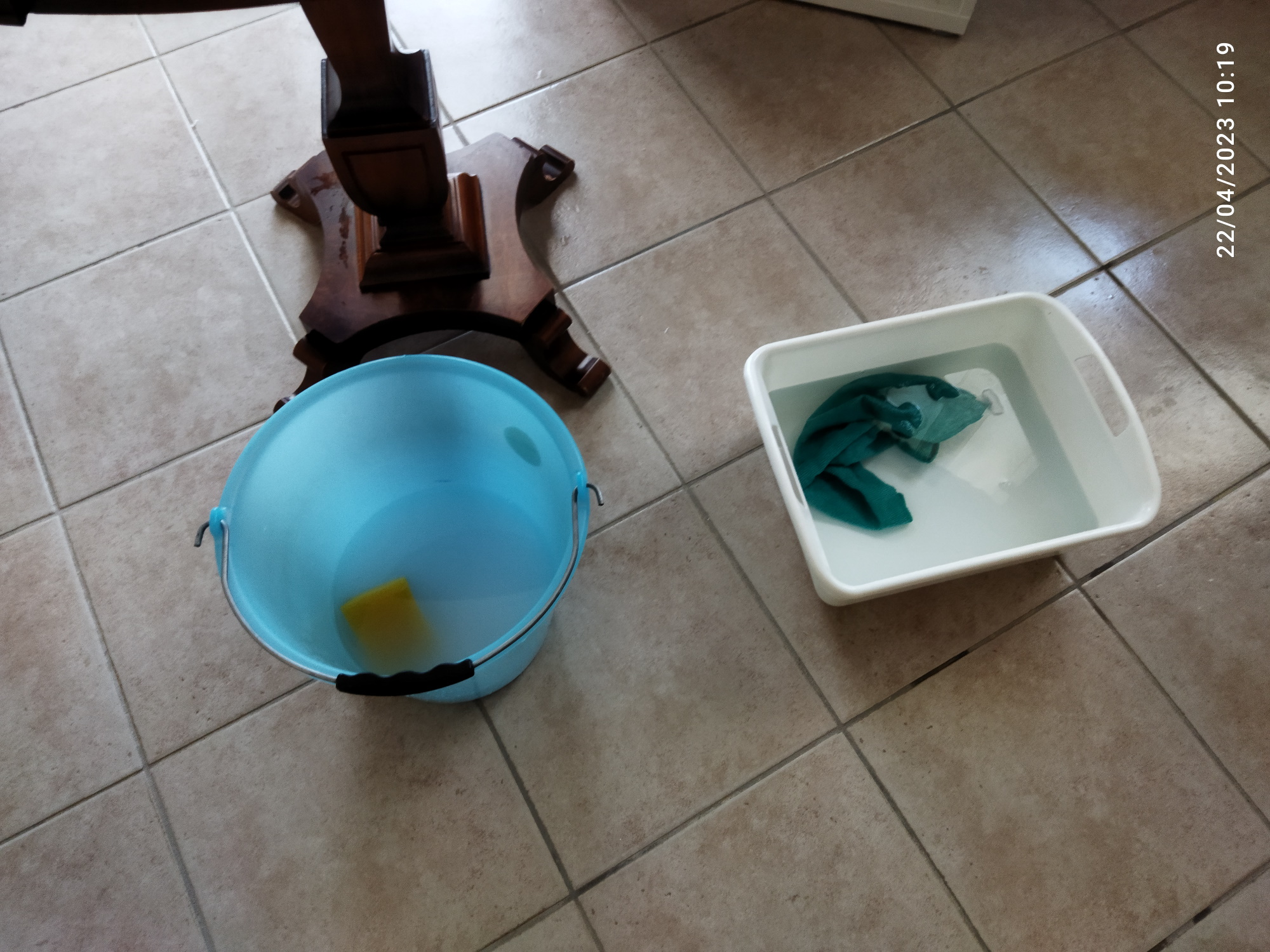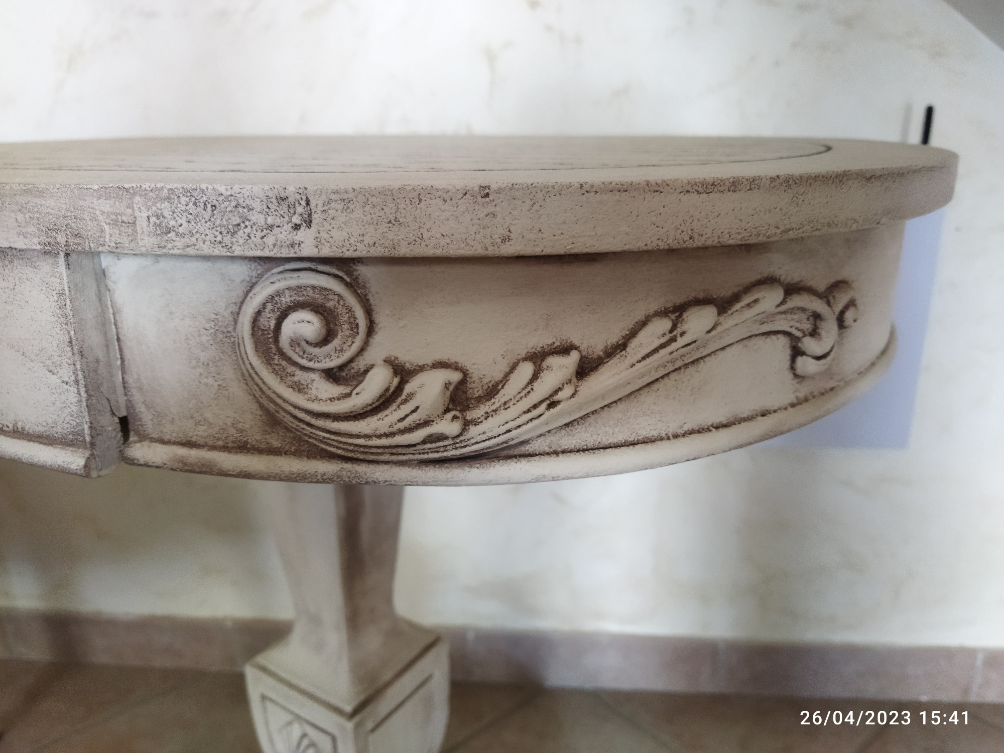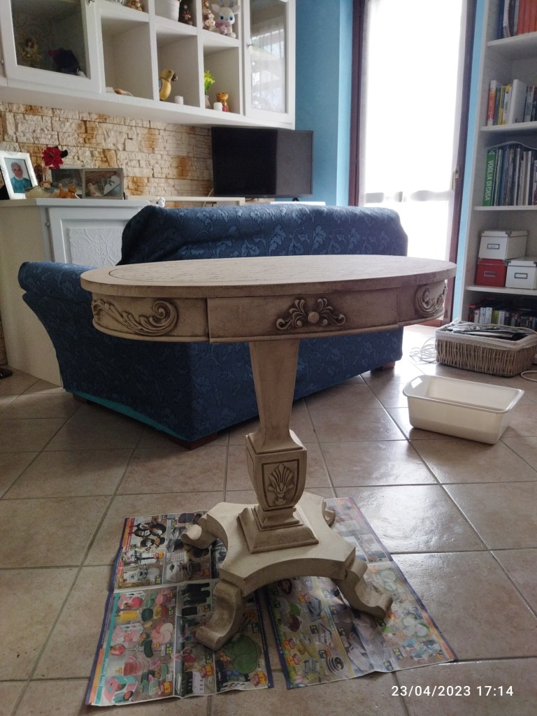 Ho lavato il tavolino con la soluzione di acqua calda, bicarbonato e ammoniaca in modo da sgrassarlo e rendere leggermente ruvida la superficie. Ho infatti adoperato una spugnetta abrasiva per lavarlo. Dopo averlo lavato l’ho risciacquato con acqua e asciugato. Era rovinato in alcuni punti a livello del bordo e del piede, quindi ho stuccato