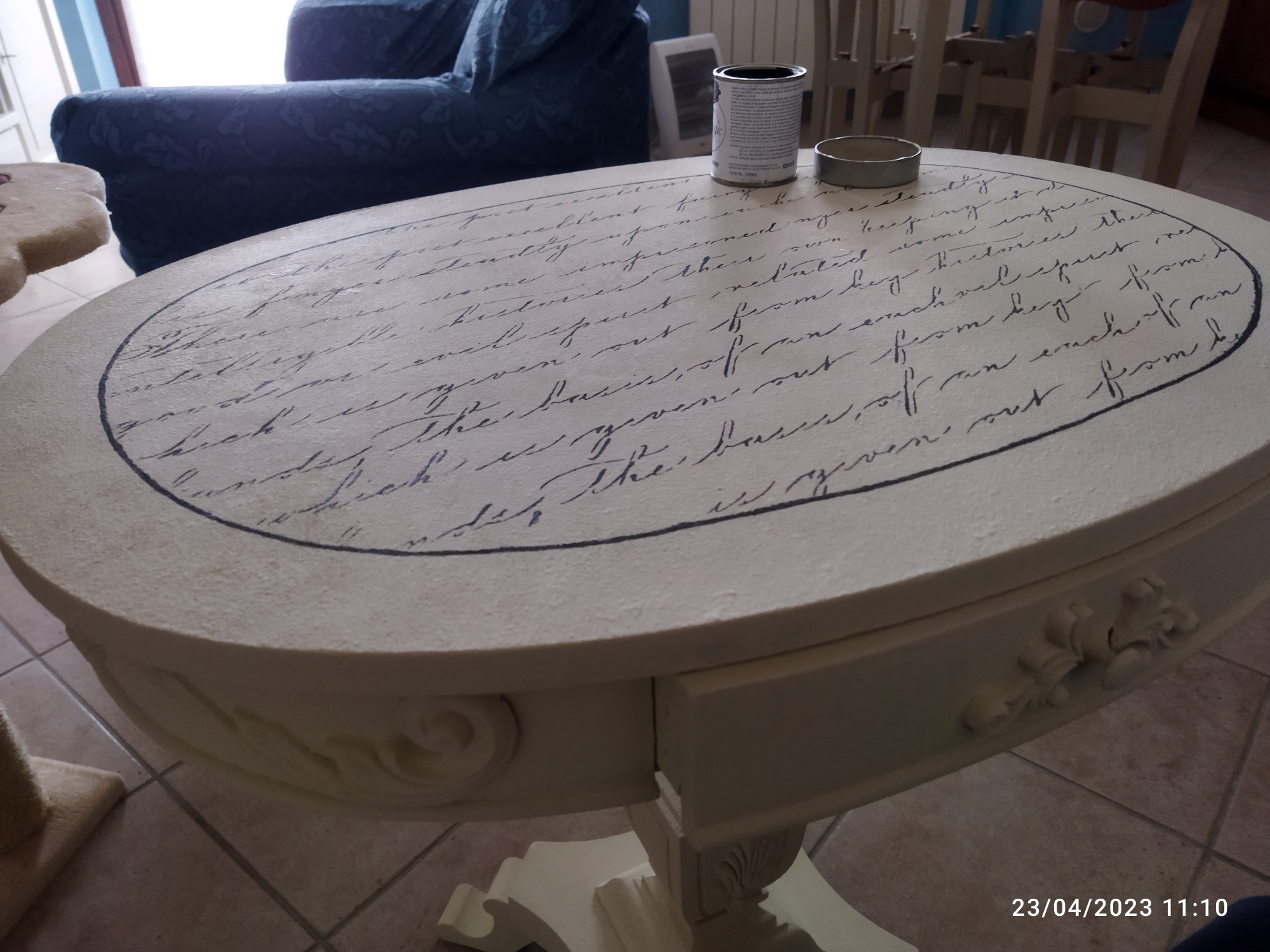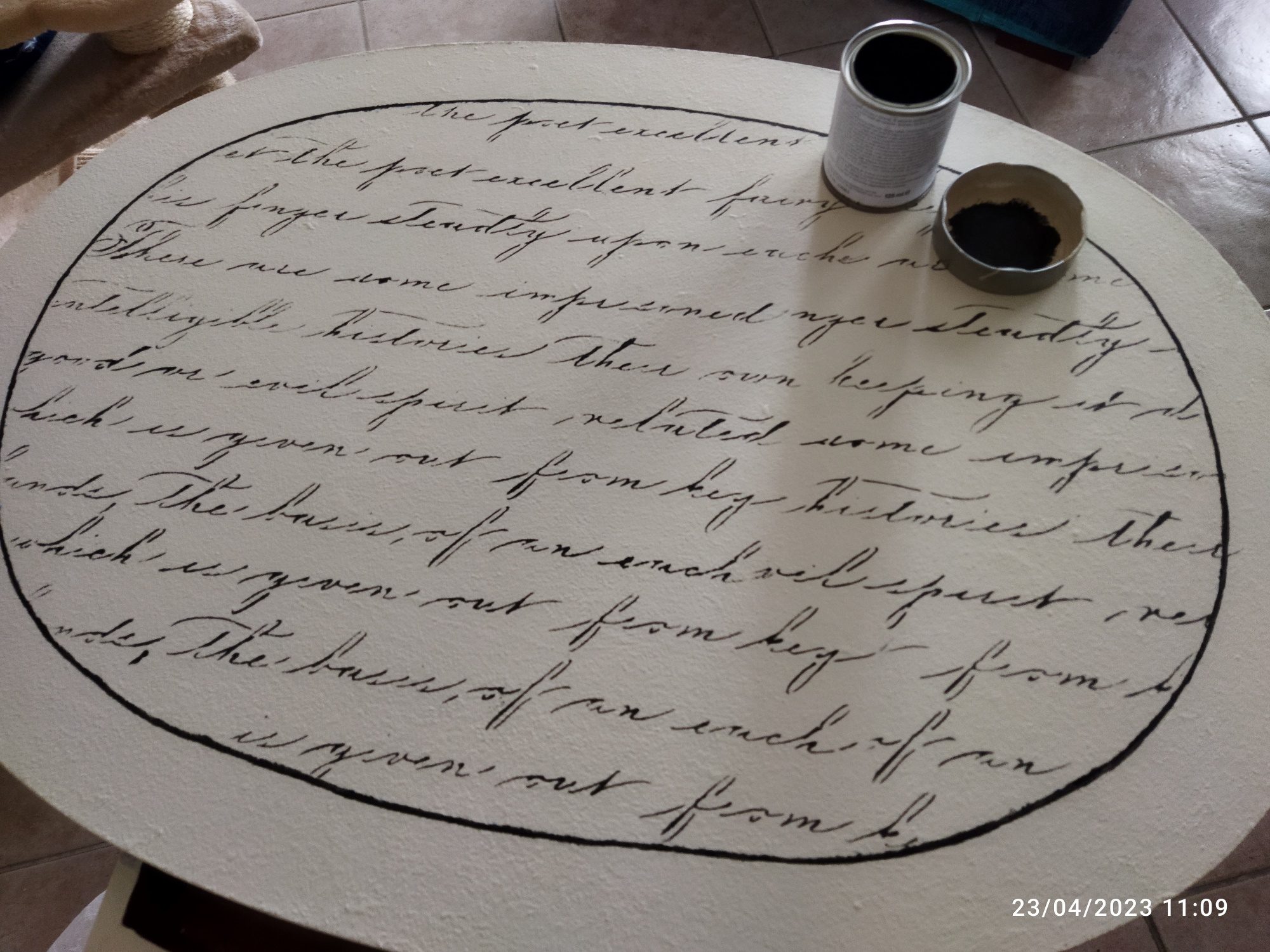 Il giorno dopo, ad asciugatura completa, ho fatto uno stancil sul piano del tavolino : ho usato sempre una chalk paint, ma di colore nero, come se fosse inchiostro… quindi ho anticato il mio tavolino con la tecnica del lavaggio : una chalk sul marrone diluita con acqua, stesa sulla superficie e poi rimossa con un panno umido. E questo è il risultato !!!