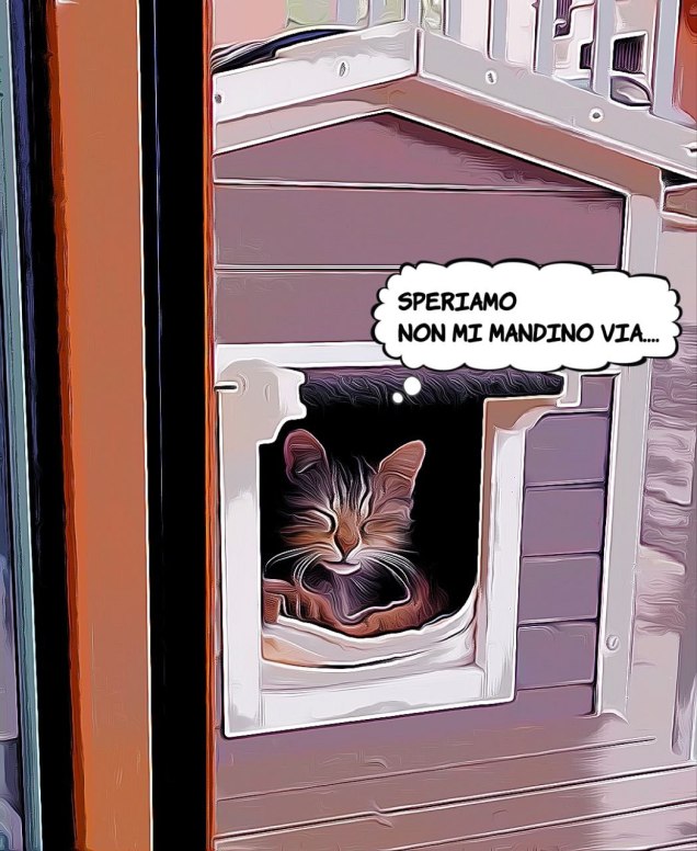 Salve a-mici !!! Lo ammetto : la vita randagia ha i suoi vantaggi, come per esempio essere libera di vivere la mia gattosità senza limiti, come dormire le notti d’estate all’aperto sotto un cielo stellato, o guardare sorgere il sole e vederlo tramontare dopo una giornata passata in riva al fiume a cacciare. Ma avere una casa è il sogno di ogni gatto. Anche Puntino ultimamente ha cambiato idea : ha scoperto che è bello fare il gatto domestico, tra divani morbidi, cucce calde, coperte pulite e cibo sicuro. E così ha traslocato dalla sua casetta mega spaziosa all’interno della Tana, dove litiga con Isotta per accaparrarsi la cuccia più calda.